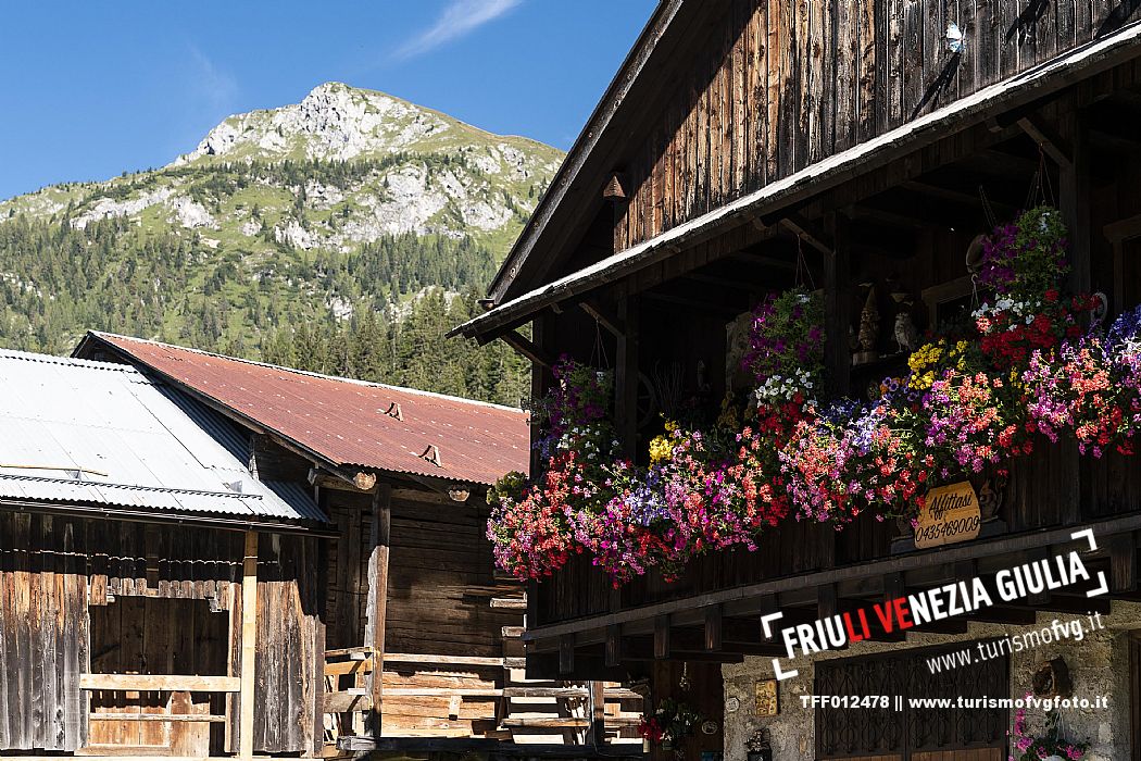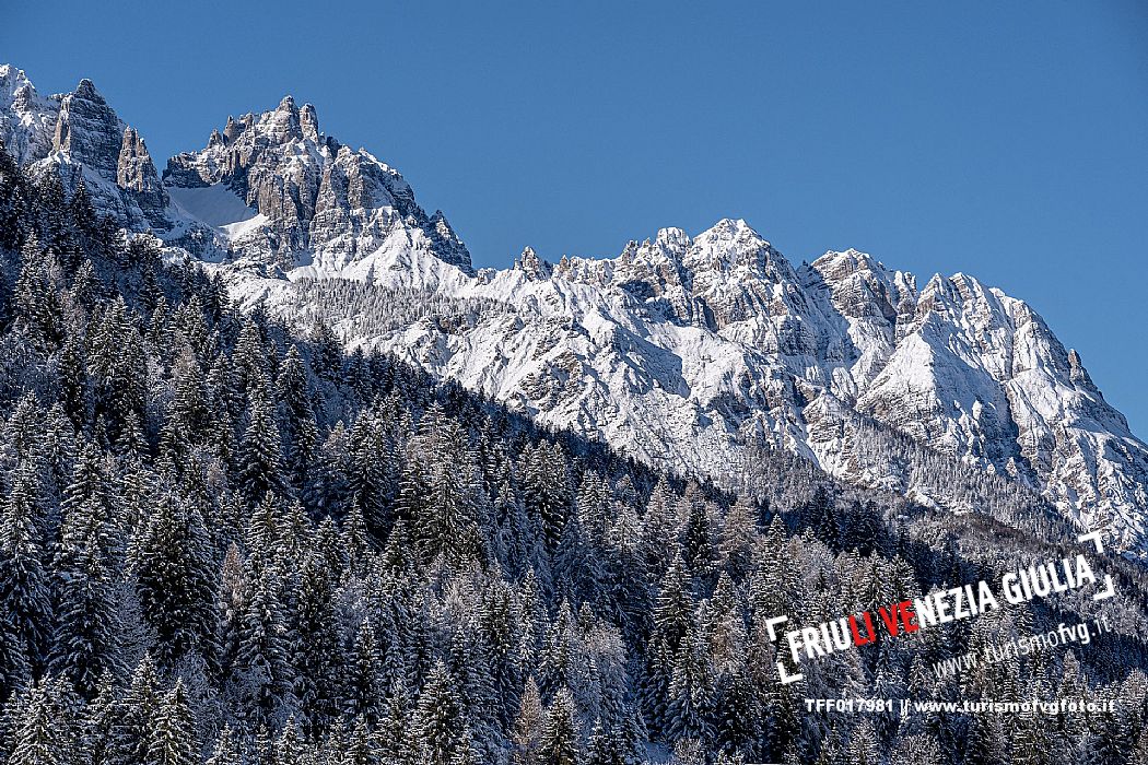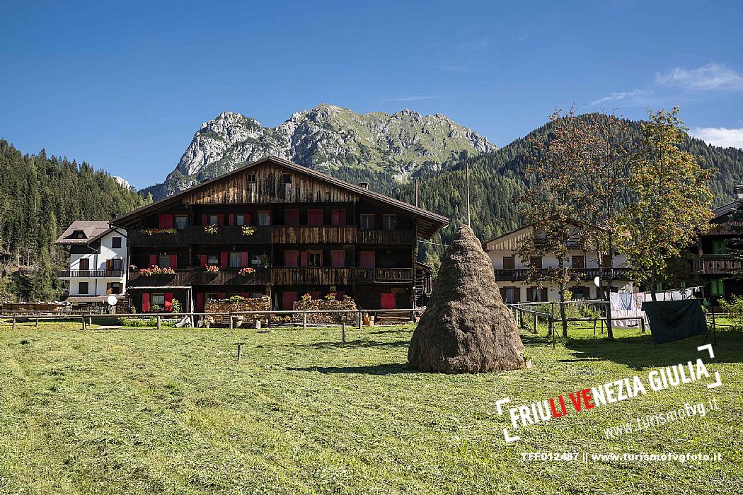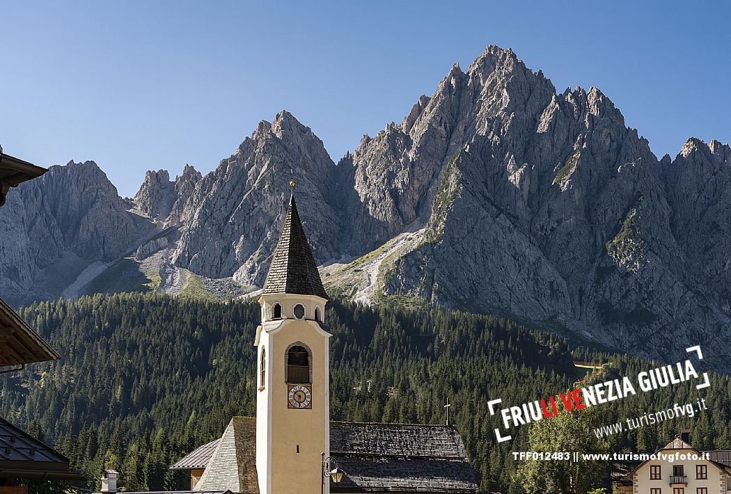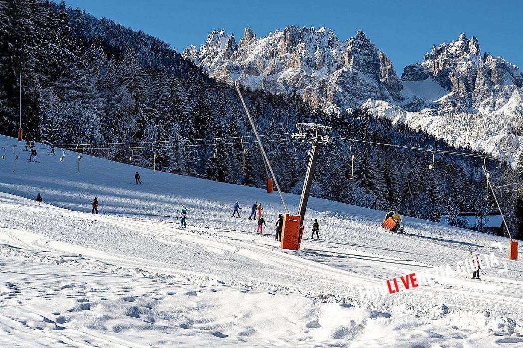 L'abitato di Piancavallo visto dall'alto. Sullo sfondo la cima del Cavallo e sulla destra le Dolomiti Friulane e la Valcellina
