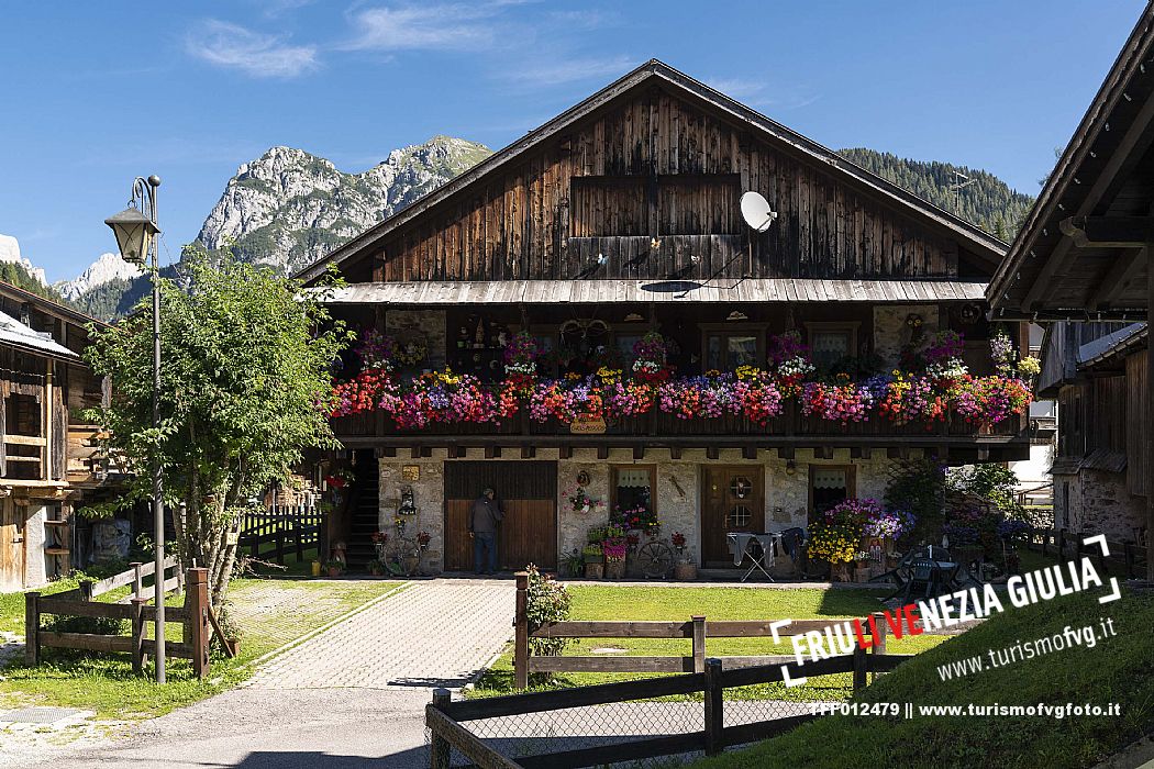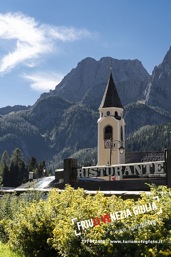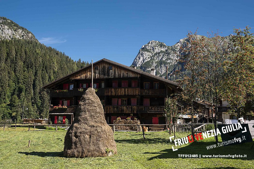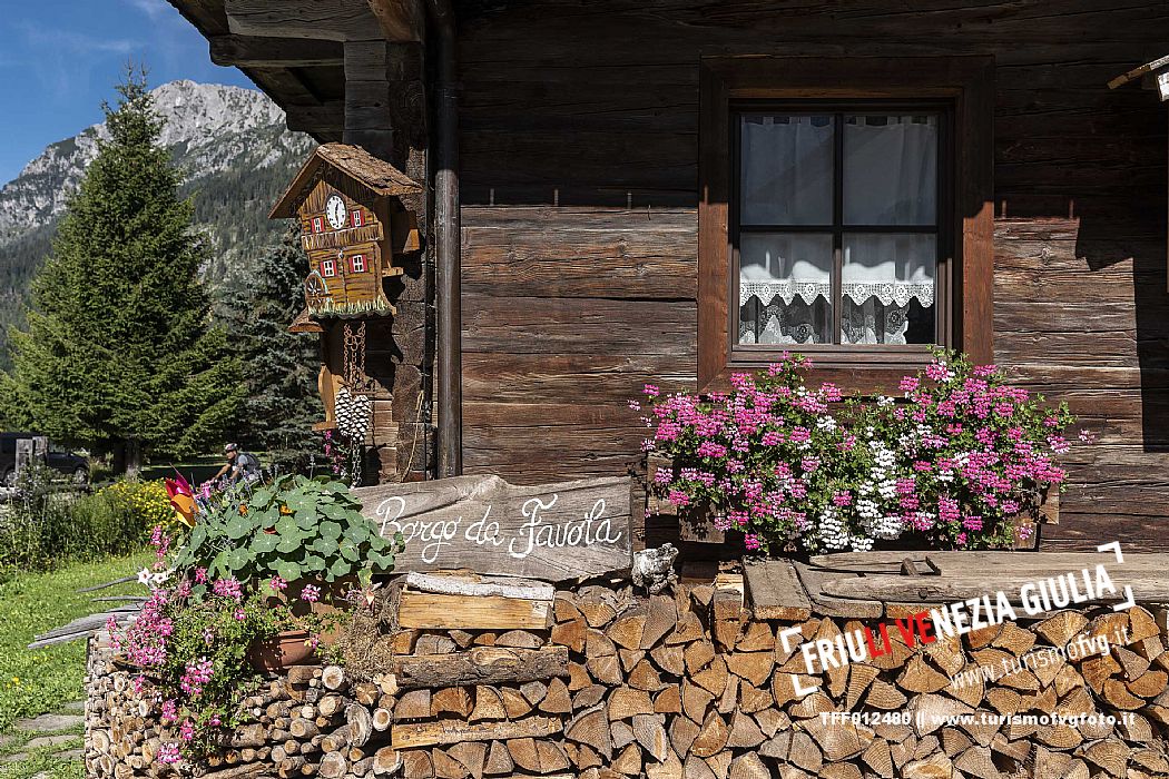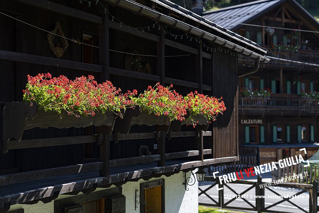 L'abitato di Piancavallo visto dall'alto. Sullo sfondo la cima del Cavallo e sulla destra le Dolomiti Friulane e la Valcellina