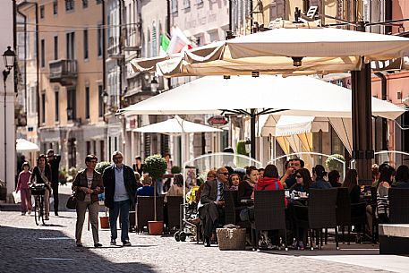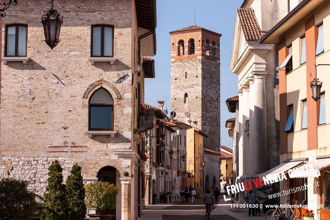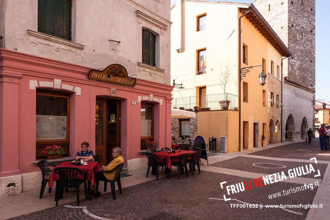 Barcis e il suo incantevole lago, in una soleggiata mattina estiva. Sullo sfondo le cime del gruppo del Cavallo e le Dolomiti Friulane. Parco Dolomiti Friulane.