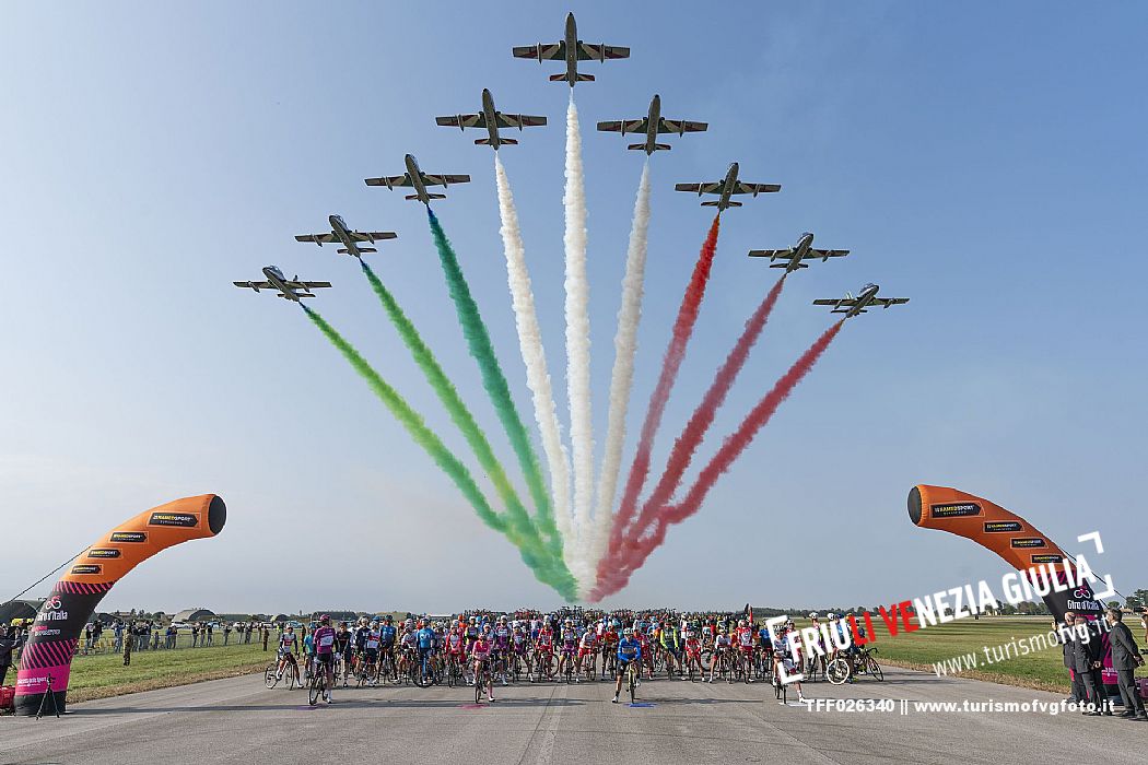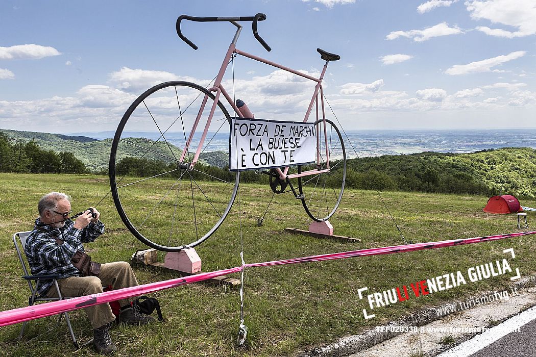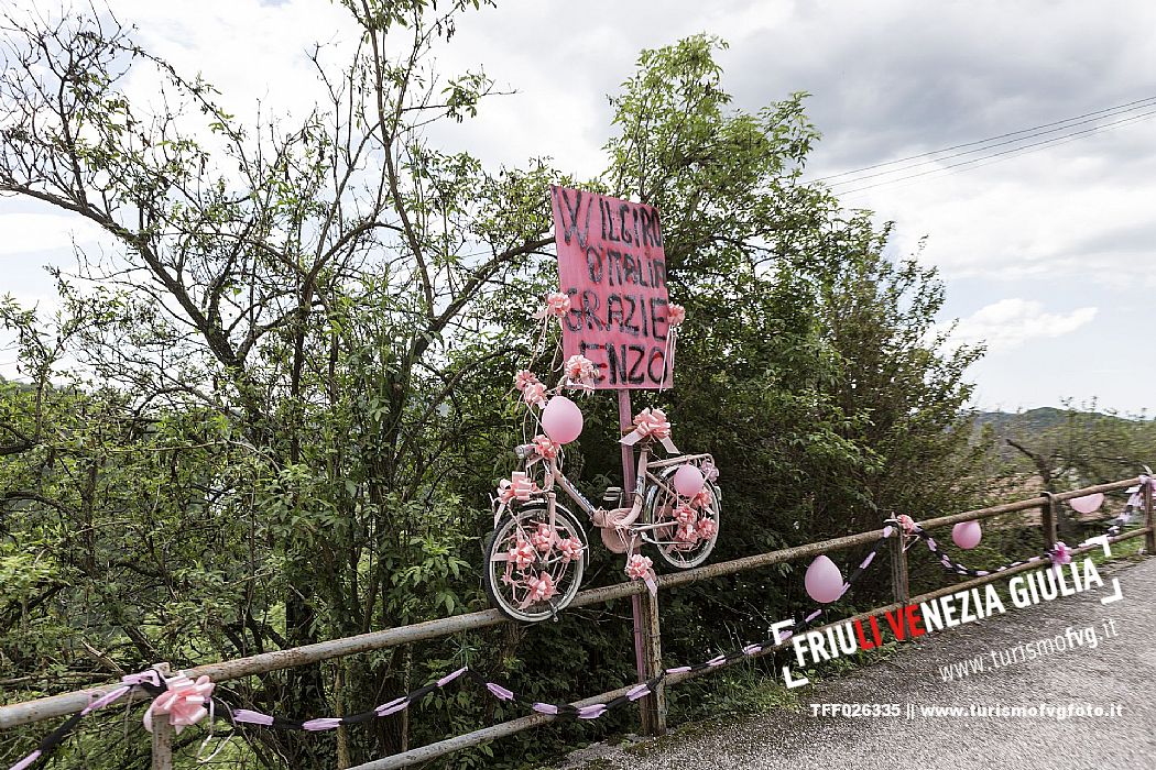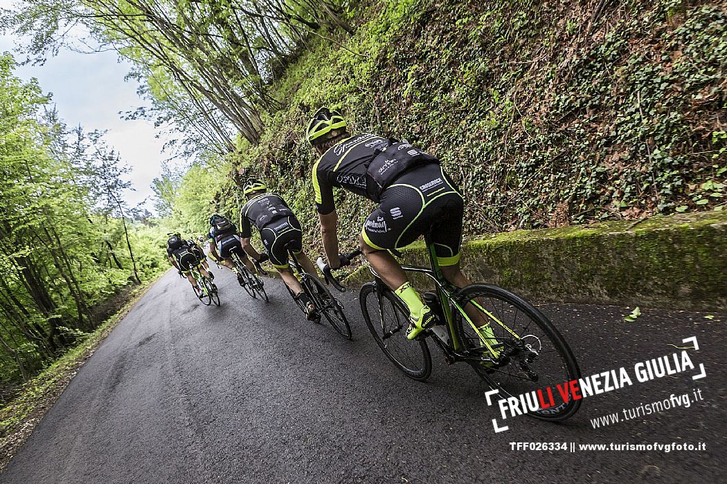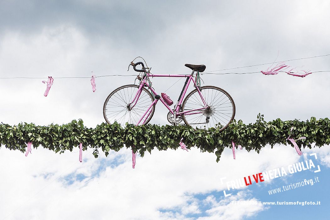 Cyclists in Cormons with the belltower of St. Adalbert Cathedral in the background.