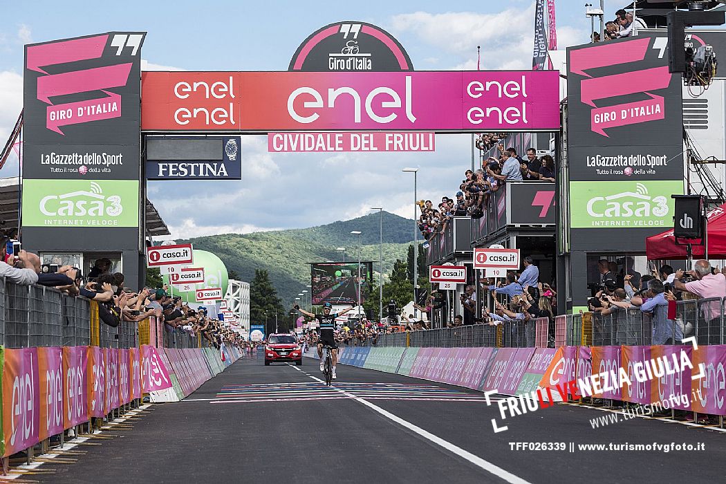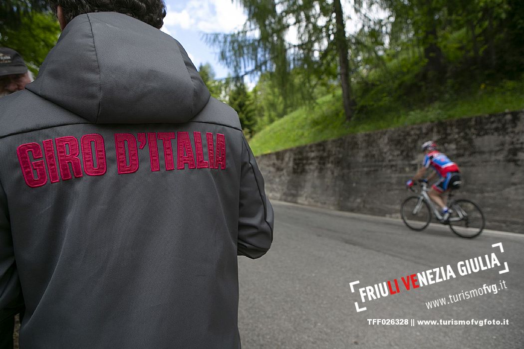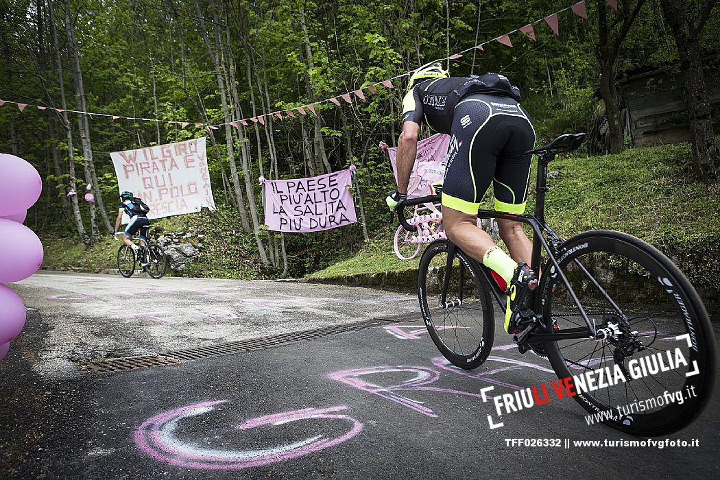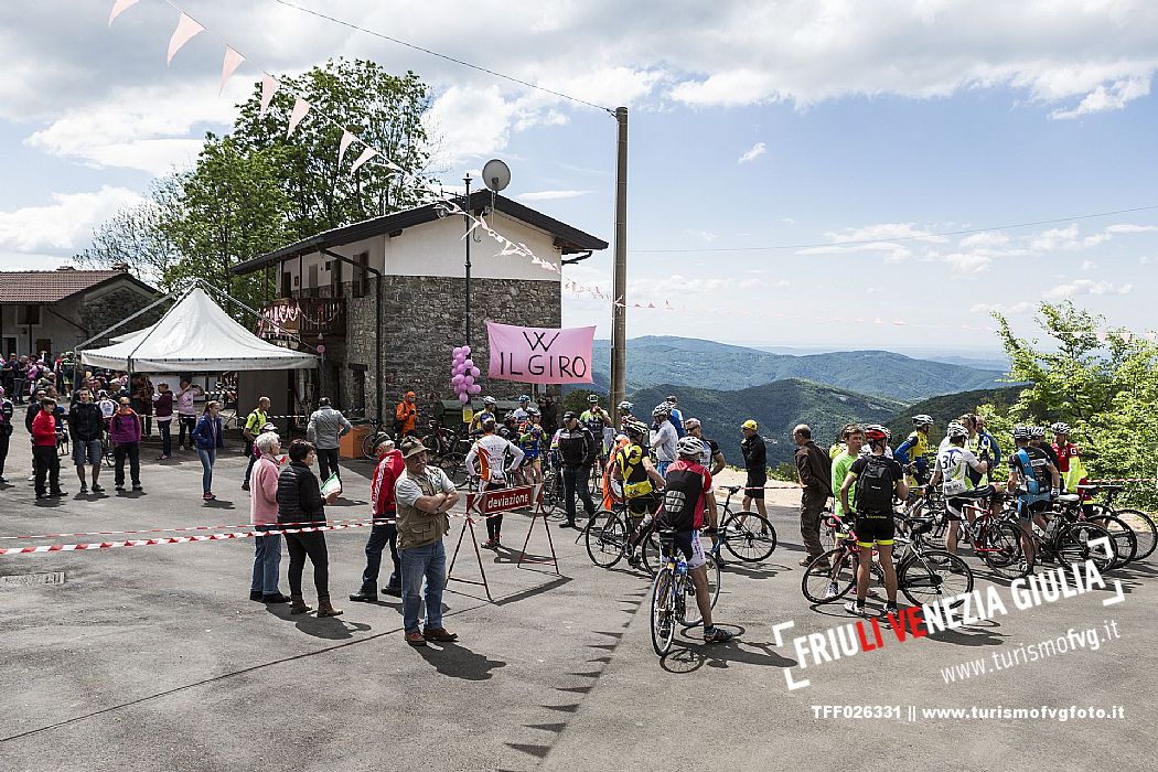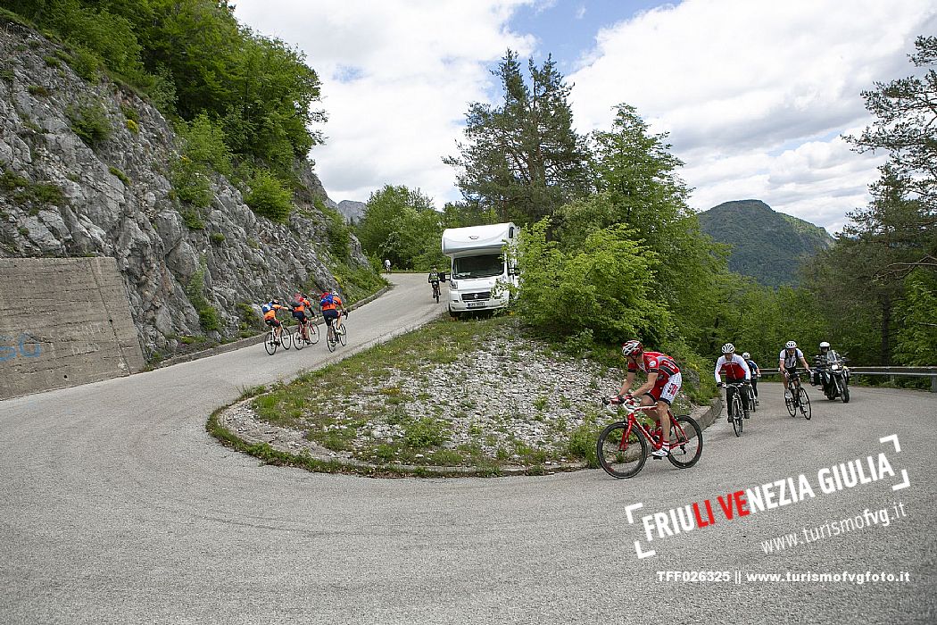 Cyclists in Cormons with the belltower of St. Adalbert Cathedral in the background.