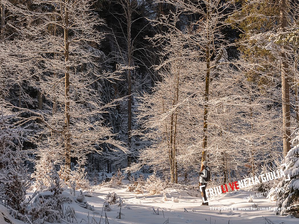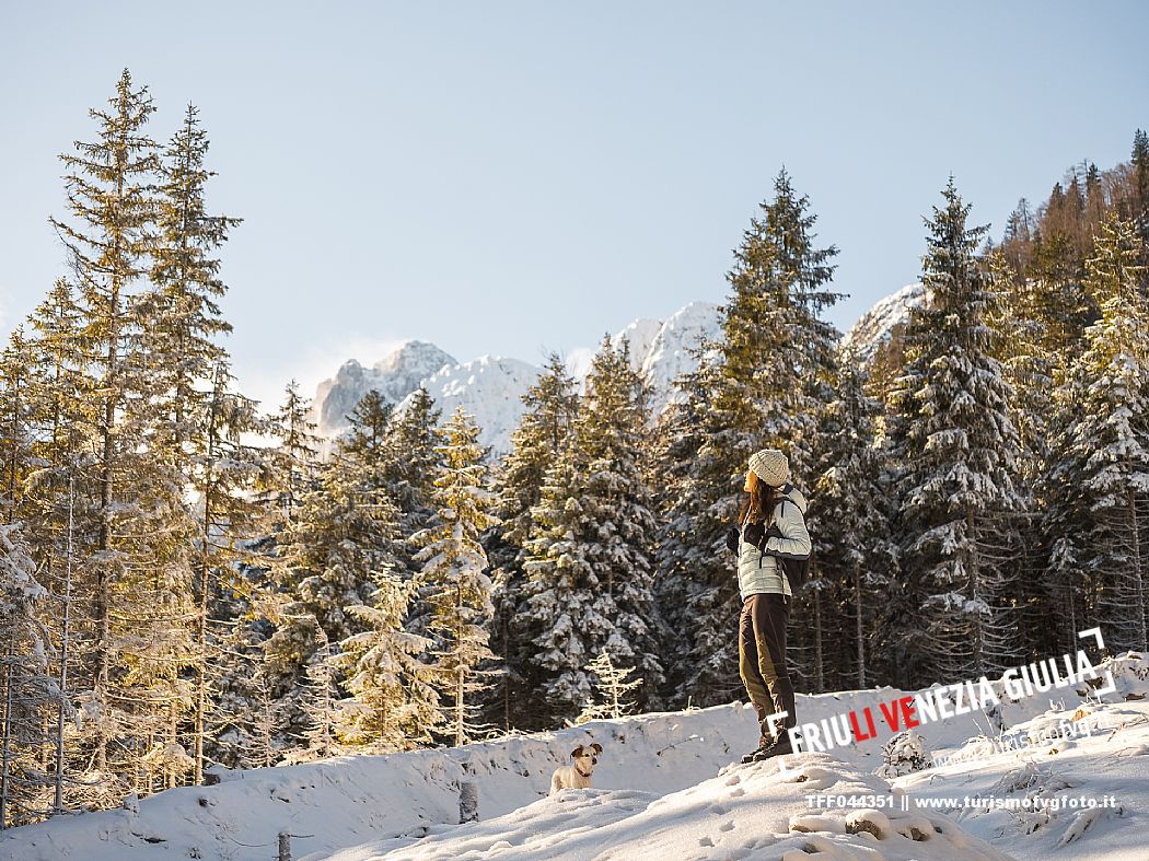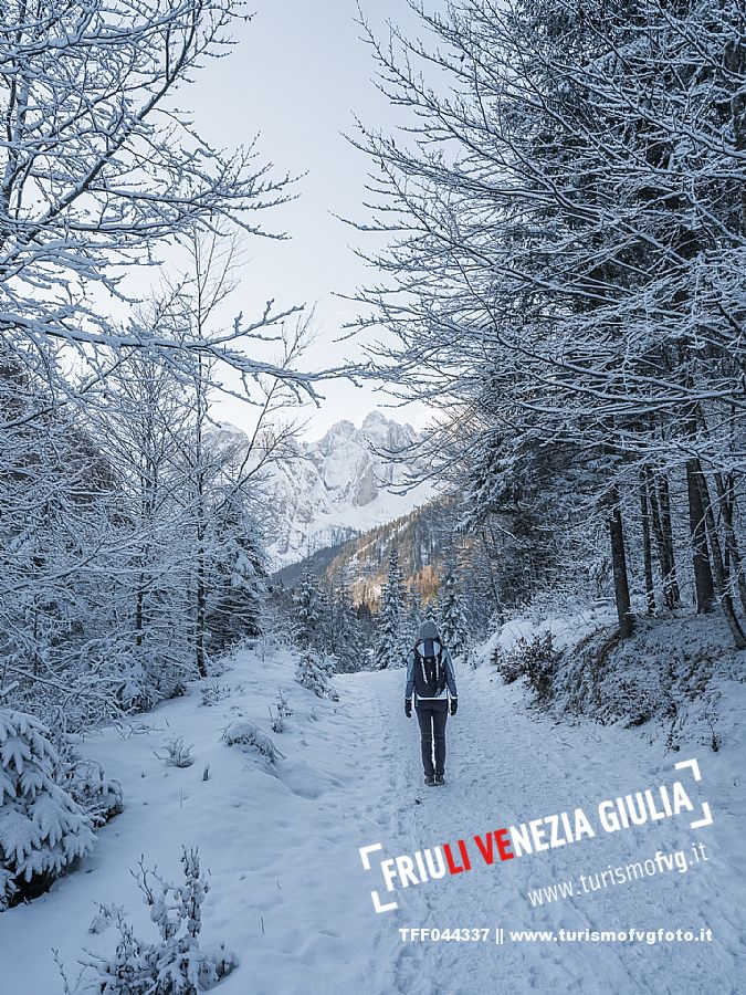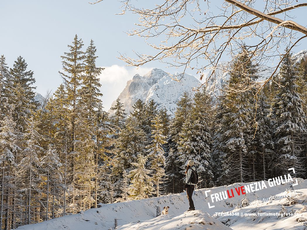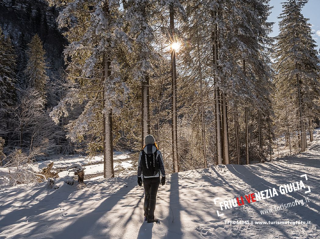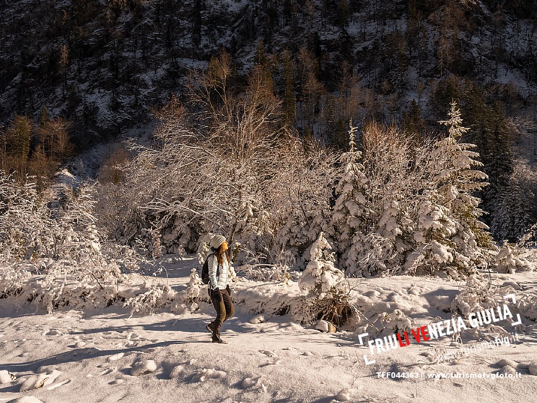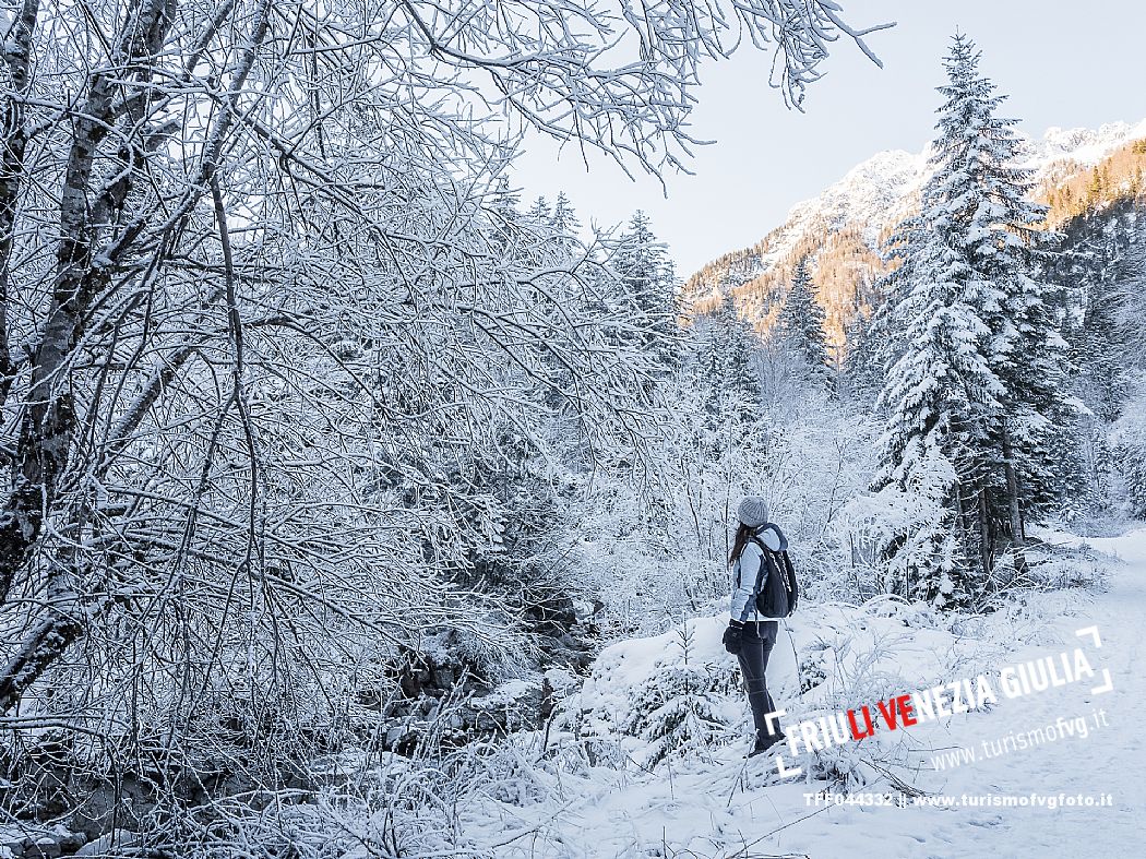 Facile passeggiata con le ciaspole o con scarponi invernali, adatta anche ai bambini, che raggiunge dalla frazione di Riofreddo una delle vallate più selvagge e belle del Tarvisiano e delle Alpi Giulie, Cave del Predil