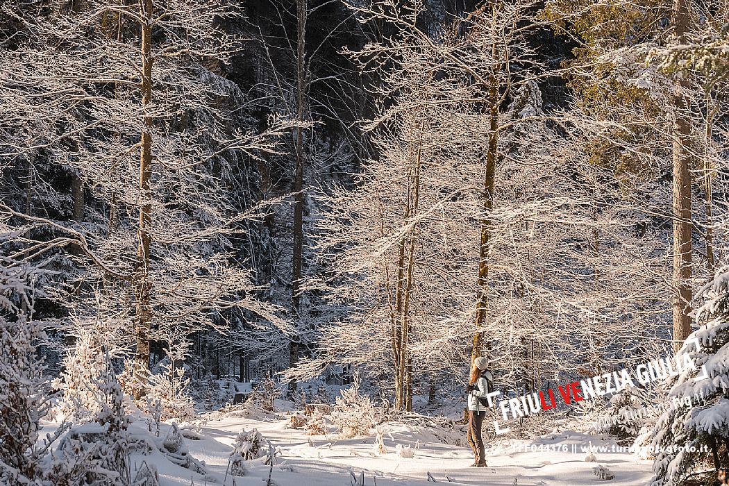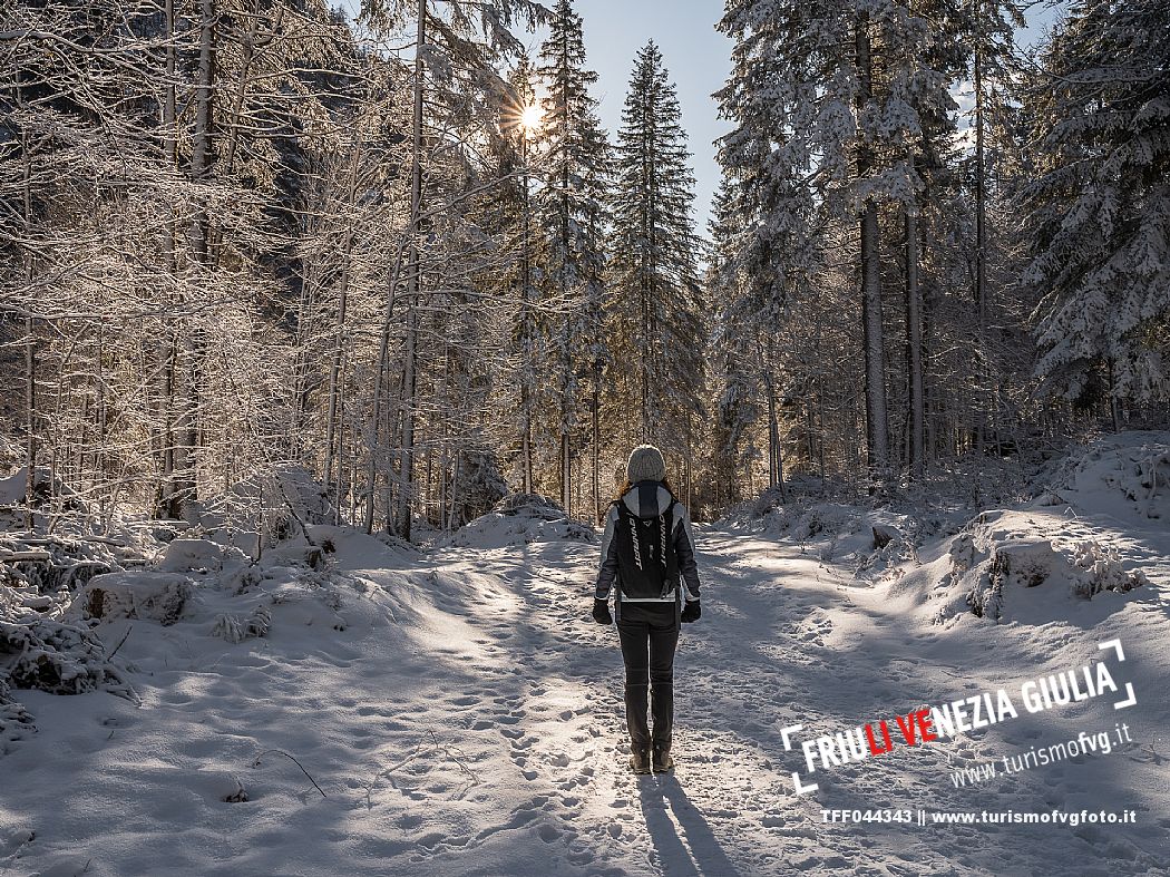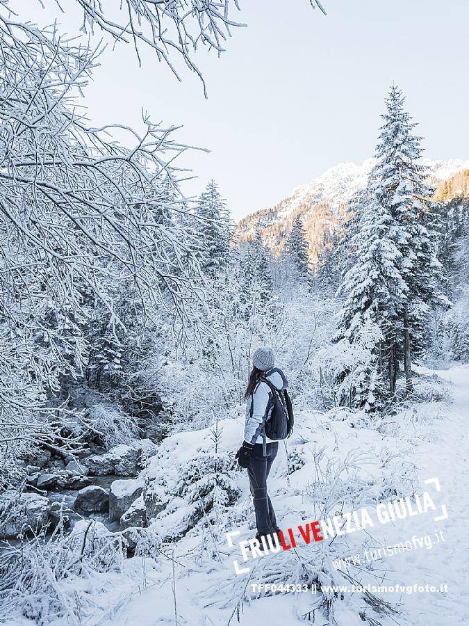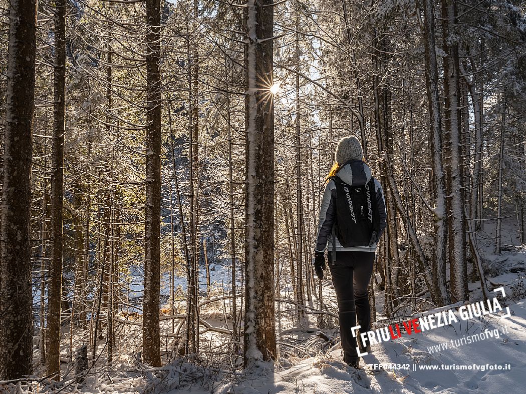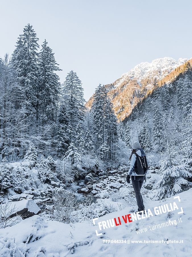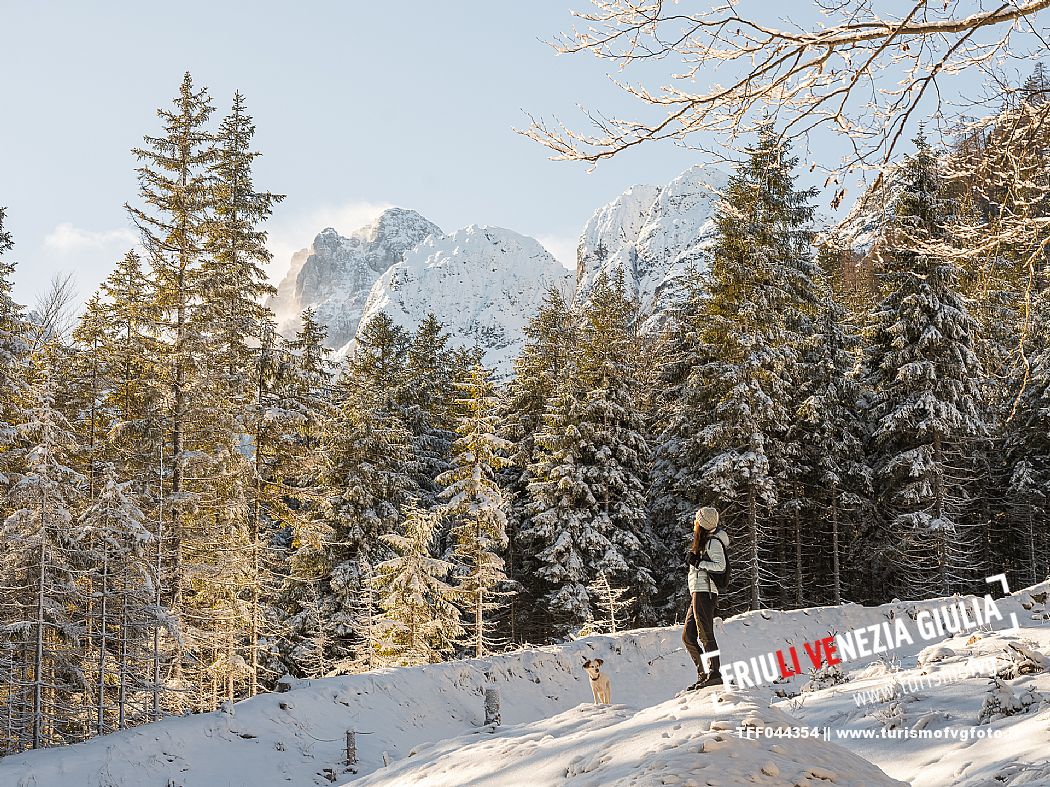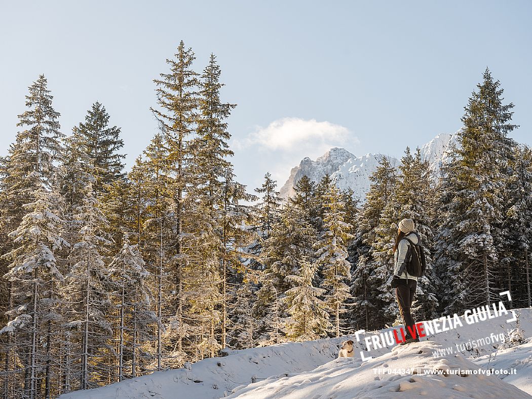 Facile passeggiata con le ciaspole o con scarponi invernali, adatta anche ai bambini, che raggiunge dalla frazione di Riofreddo una delle vallate più selvagge e belle del Tarvisiano e delle Alpi Giulie, Cave del Predil
