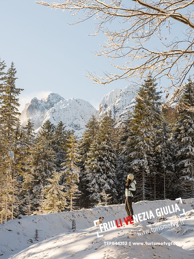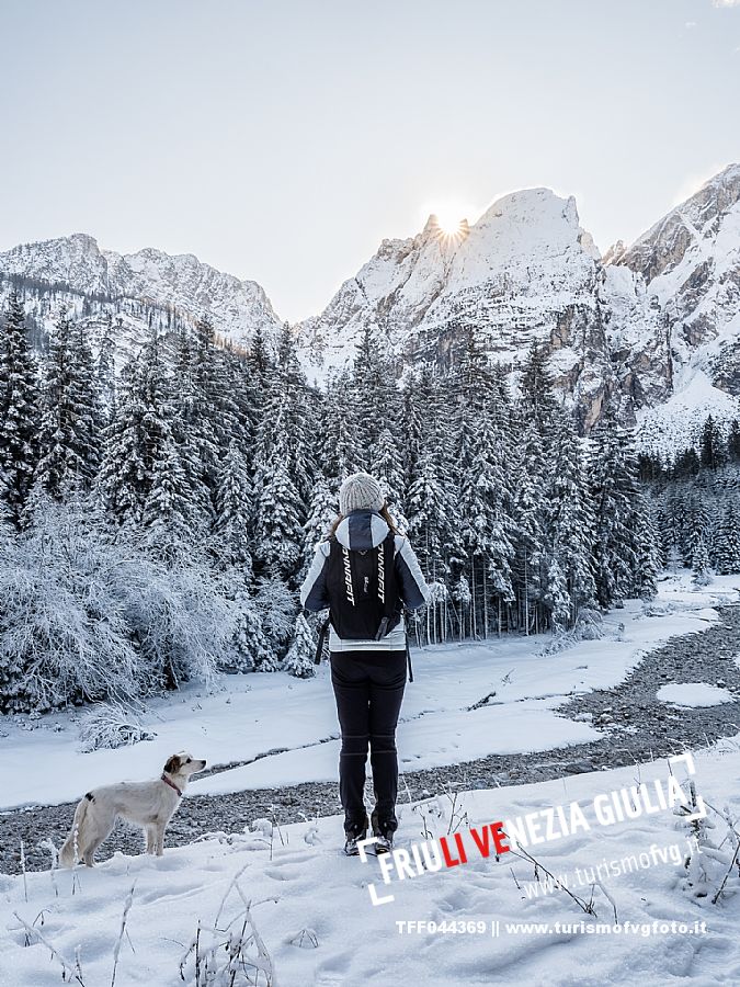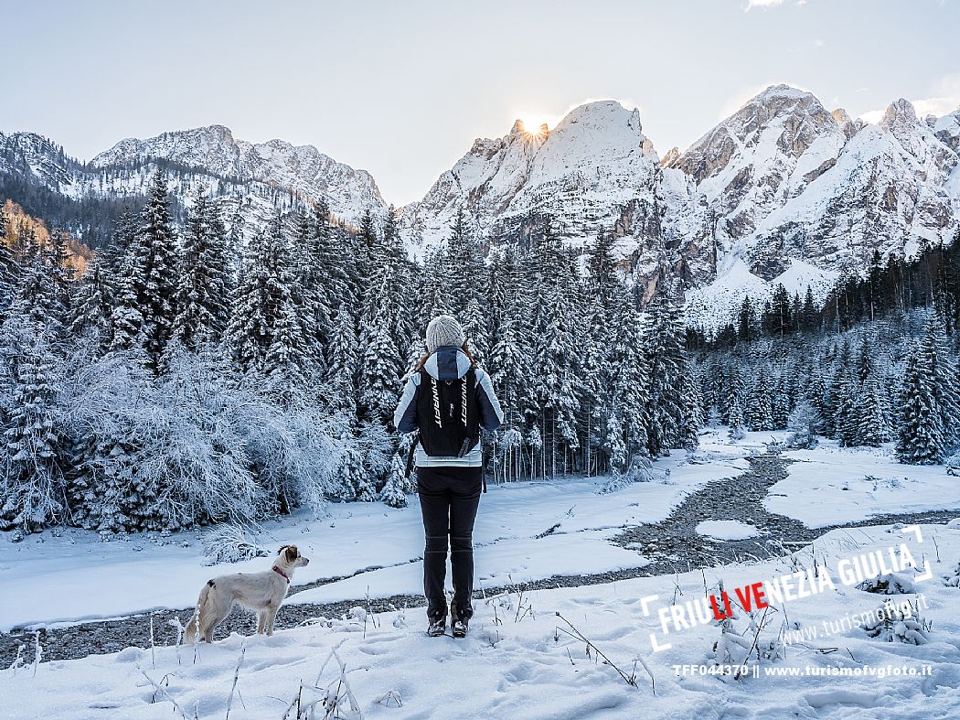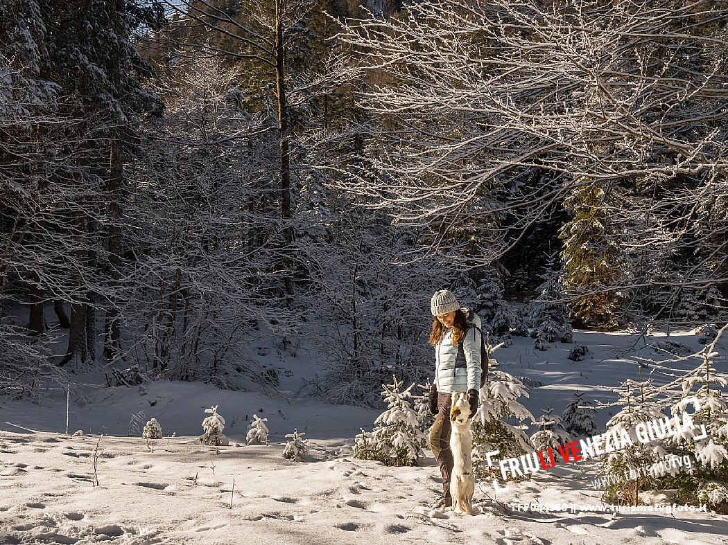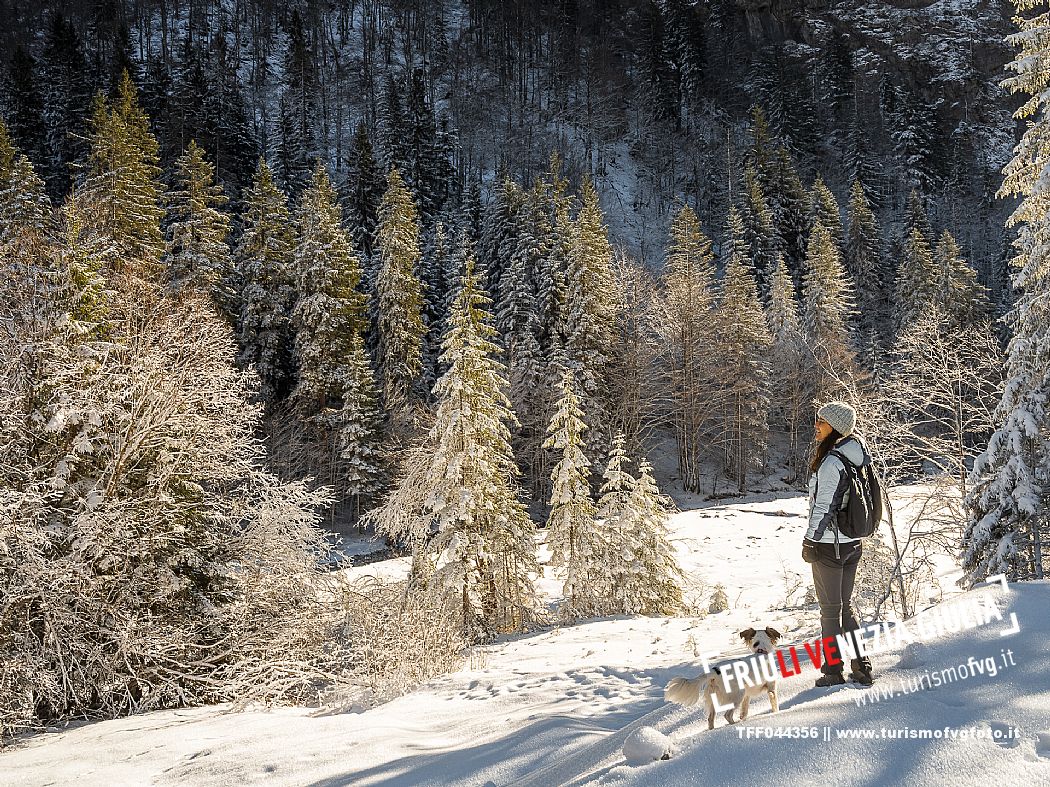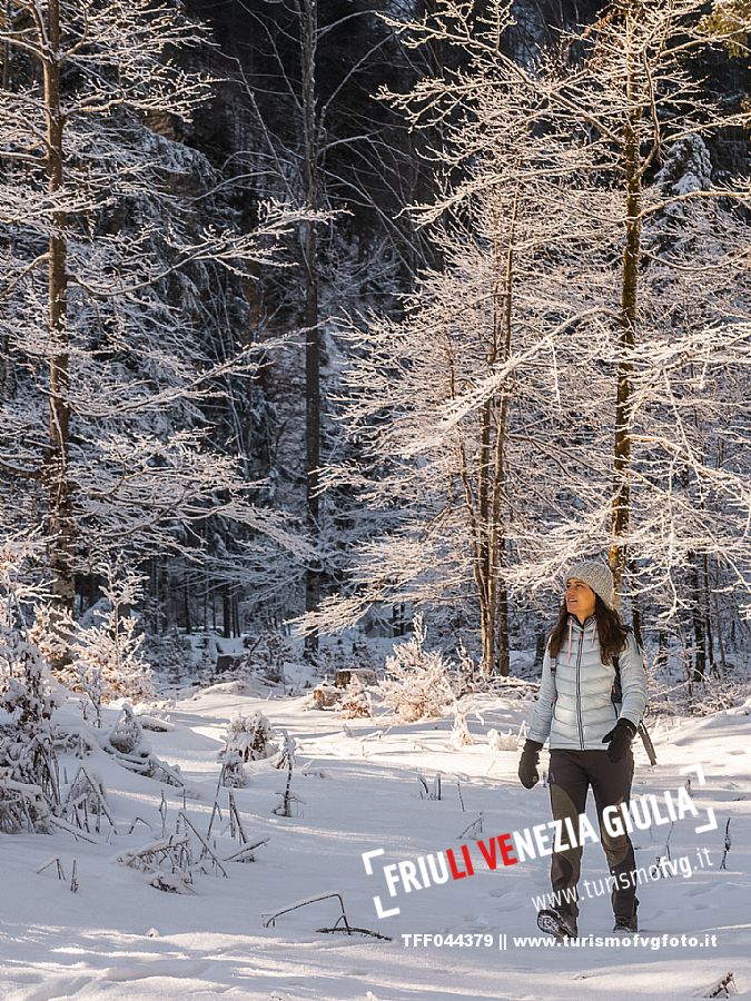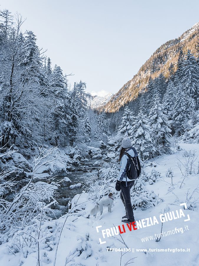 Facile passeggiata con le ciaspole o con scarponi invernali, adatta anche ai bambini, che raggiunge dalla frazione di Riofreddo una delle vallate più selvagge e belle del Tarvisiano e delle Alpi Giulie, Cave del Predil