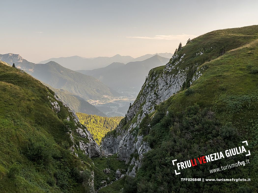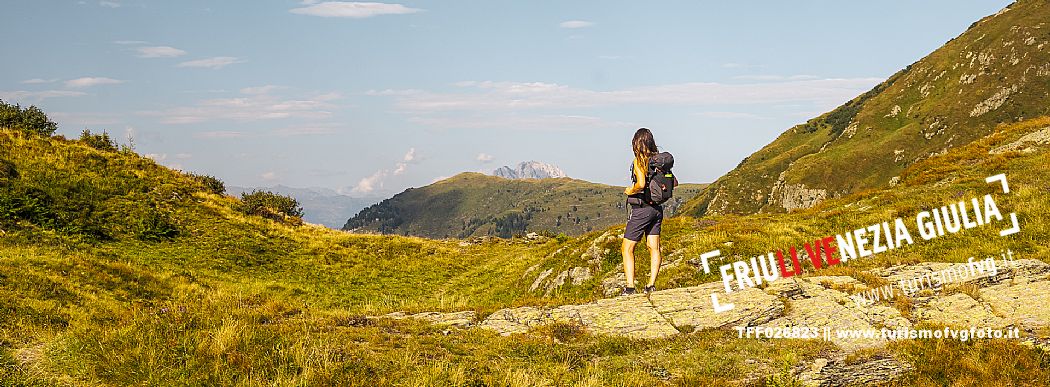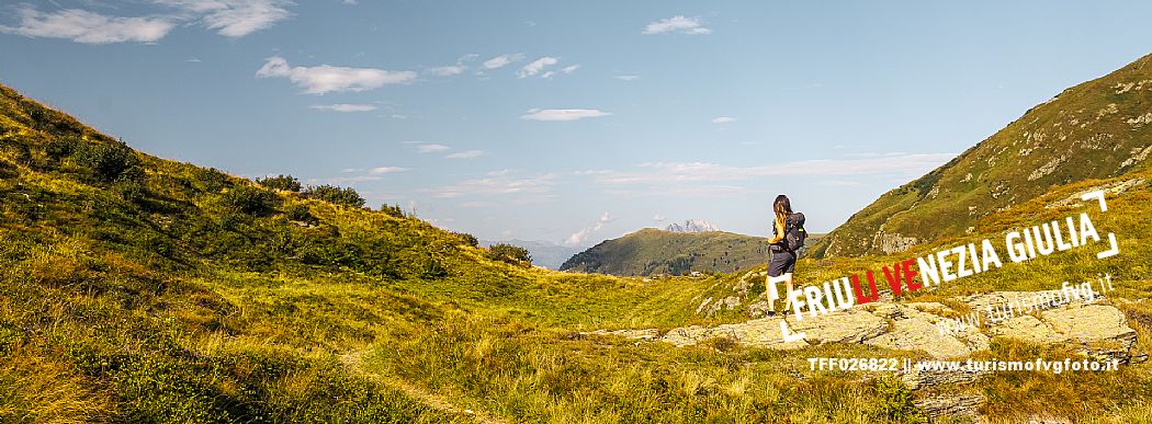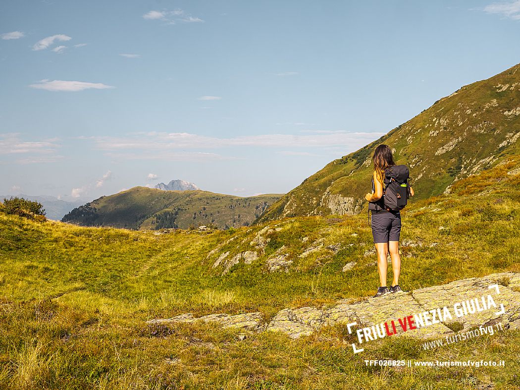 Il lago di Avostanis, lungo il sentiero che sale da Malga Pramosio. Vista sui paesi della Carnia.