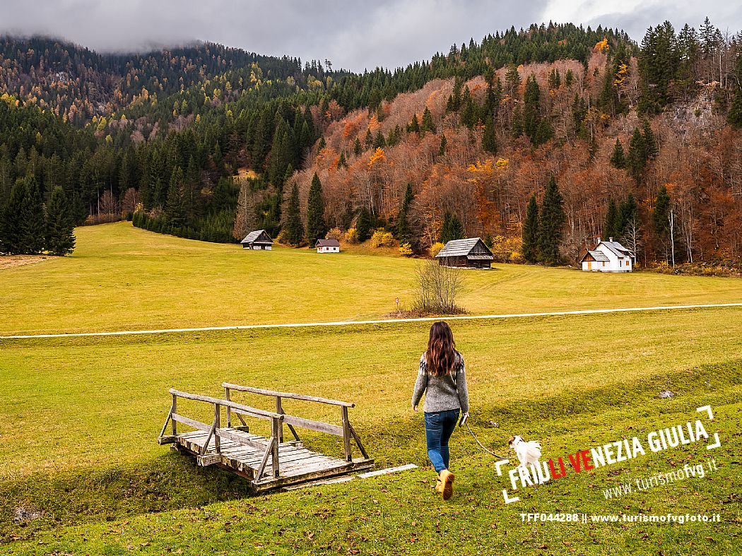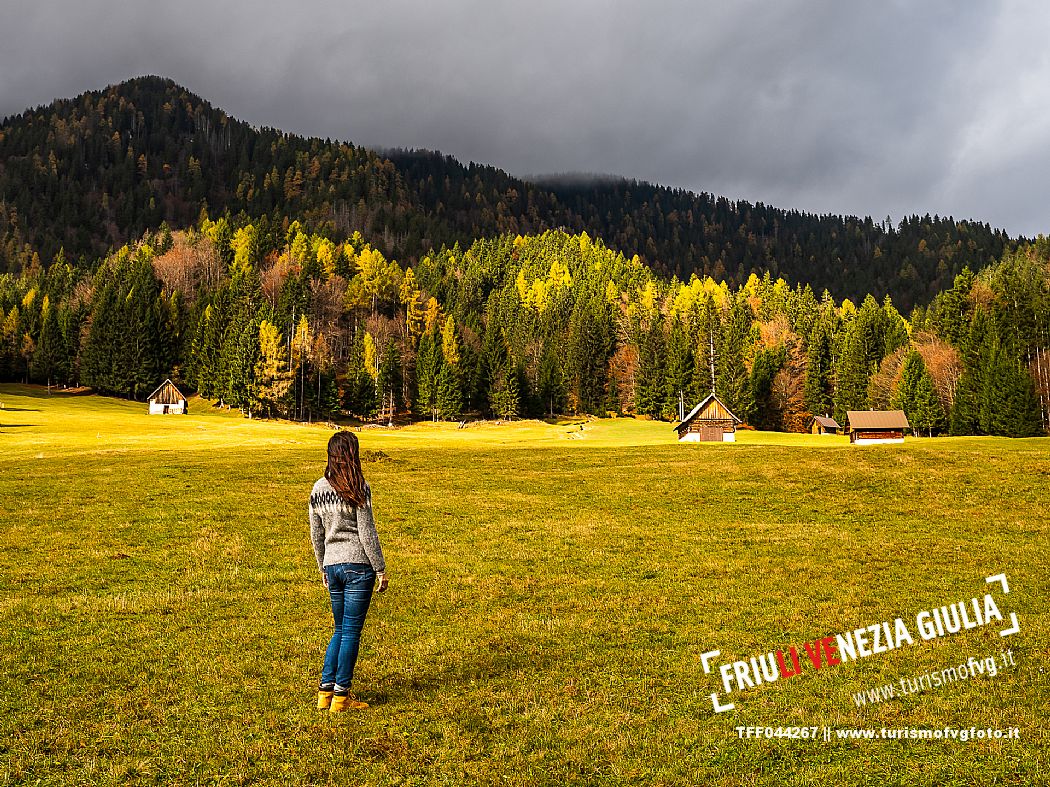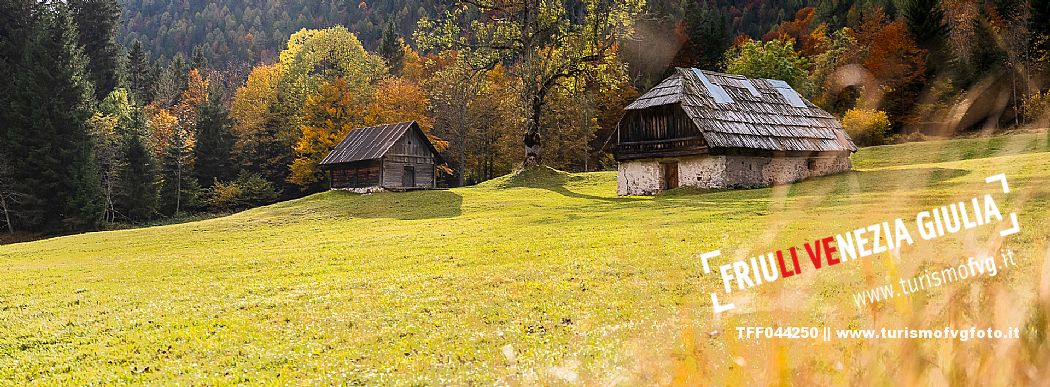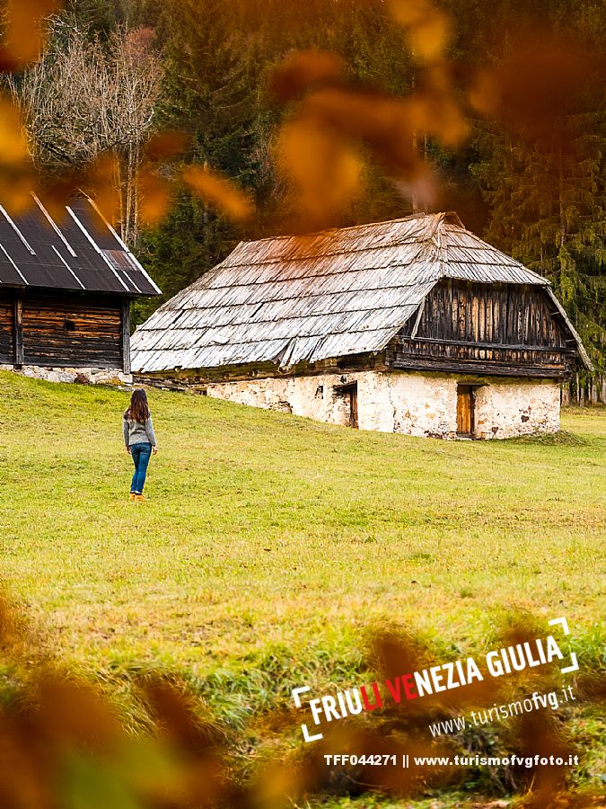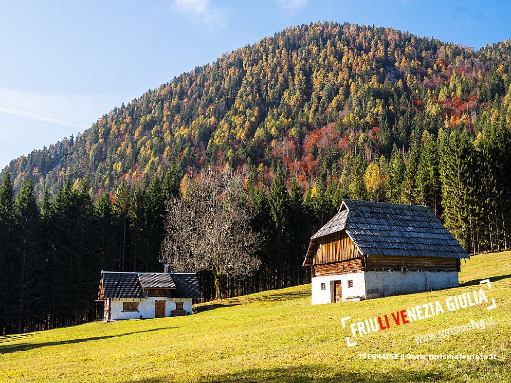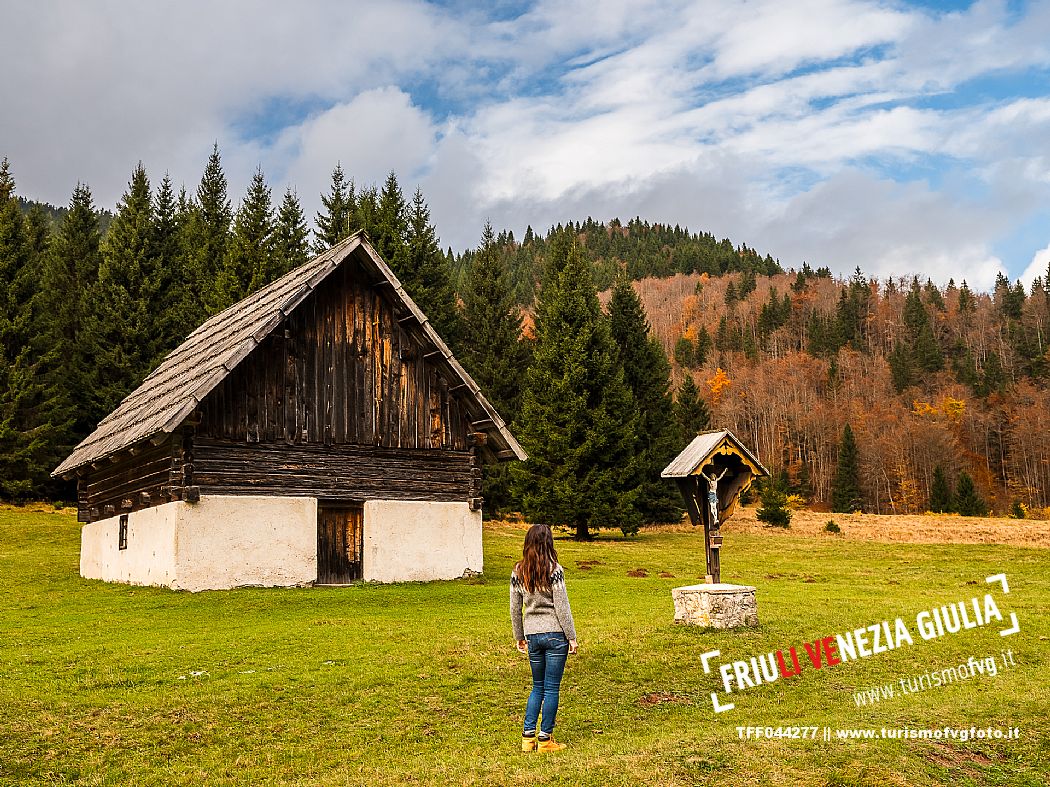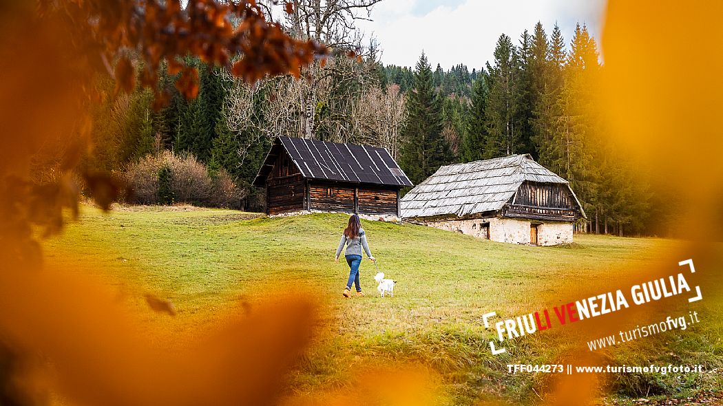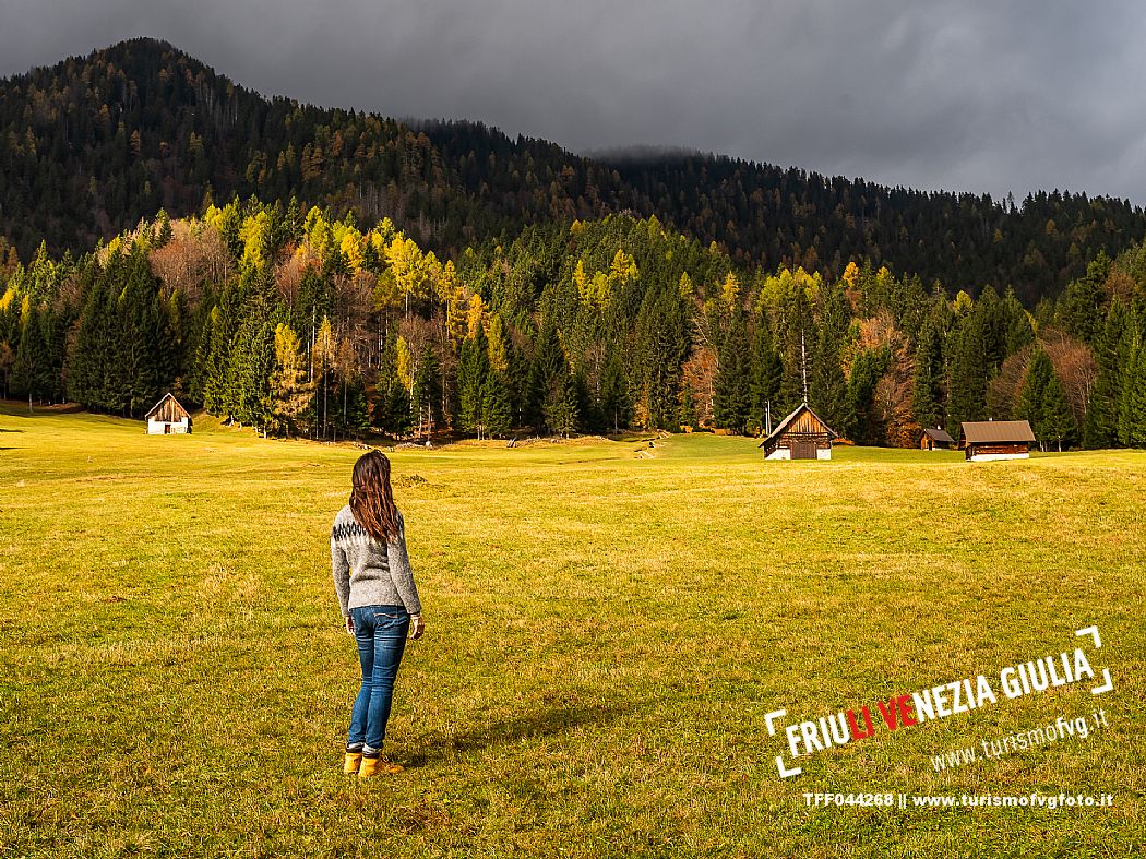 I prati della Val Bartolo. Qui ci si immerge nel verde, una distesa di prati puntellata dalle tradizionali baite, caratterizzate dal legno e dai tetti spioventi con balconi adorni di fiori. Paesaggi e trekking in autunno. Tarvisio, Alpi Giulie.