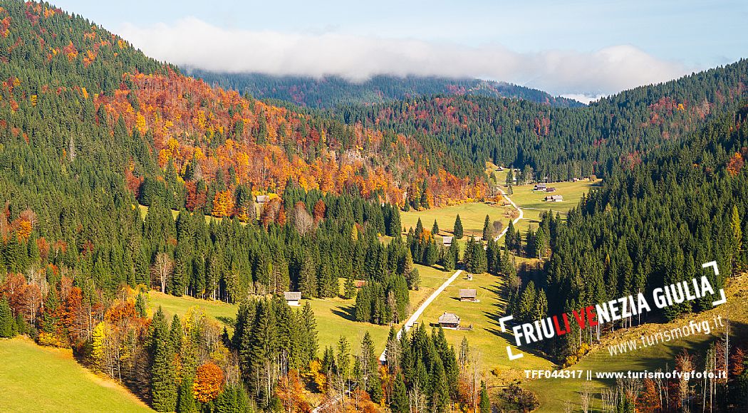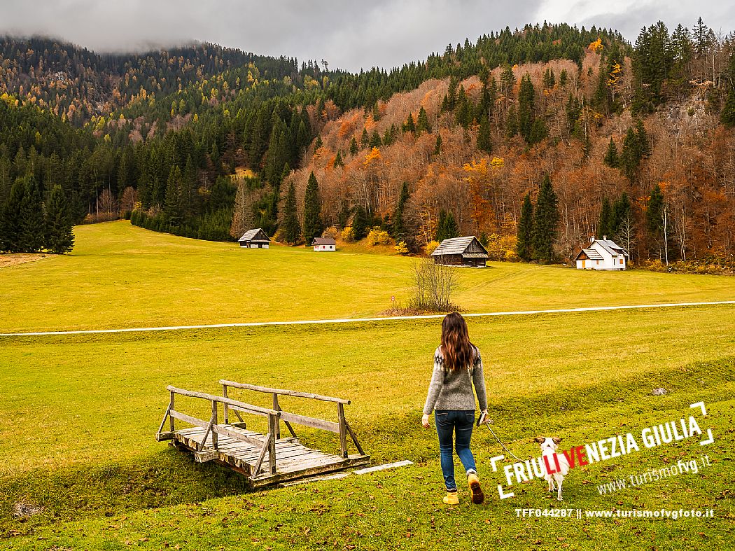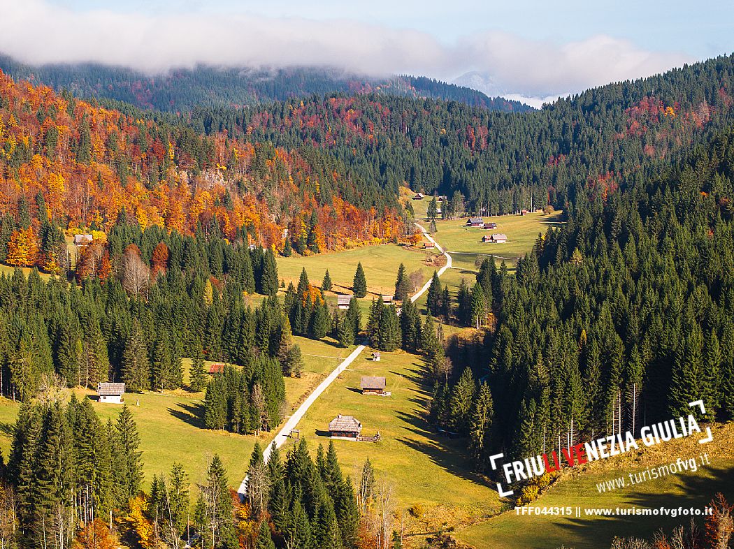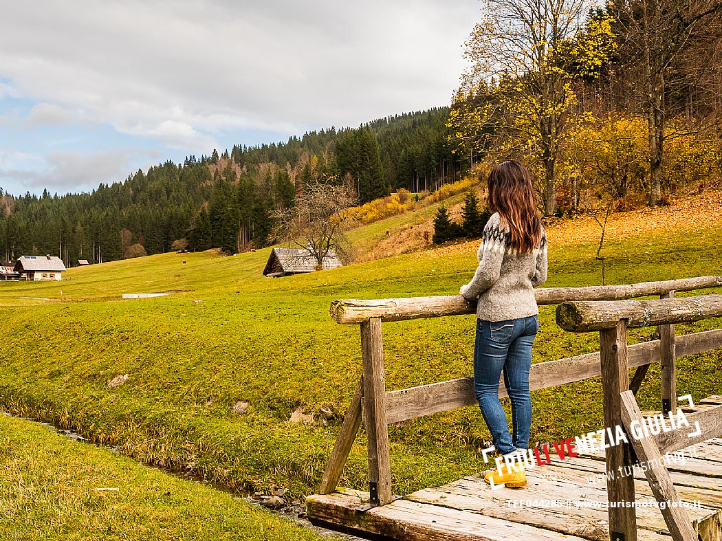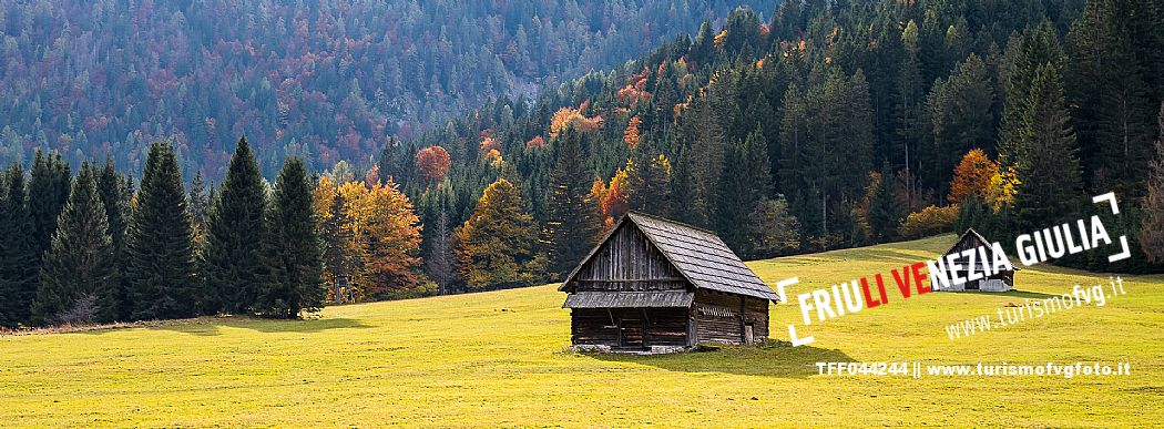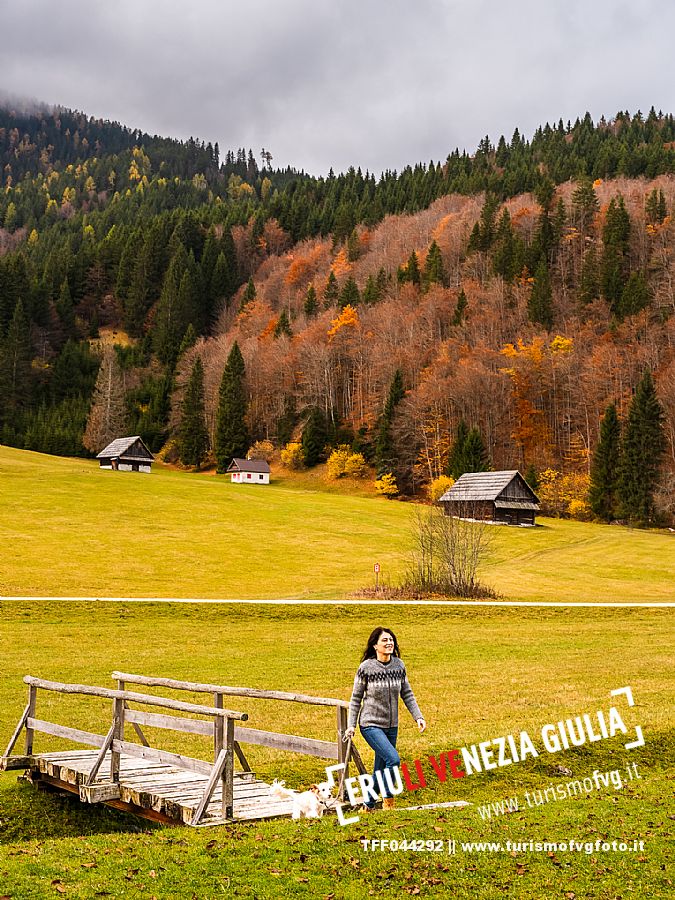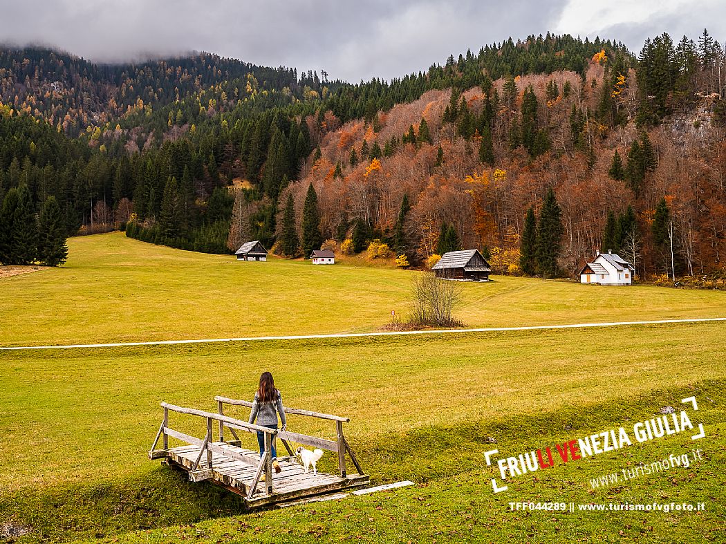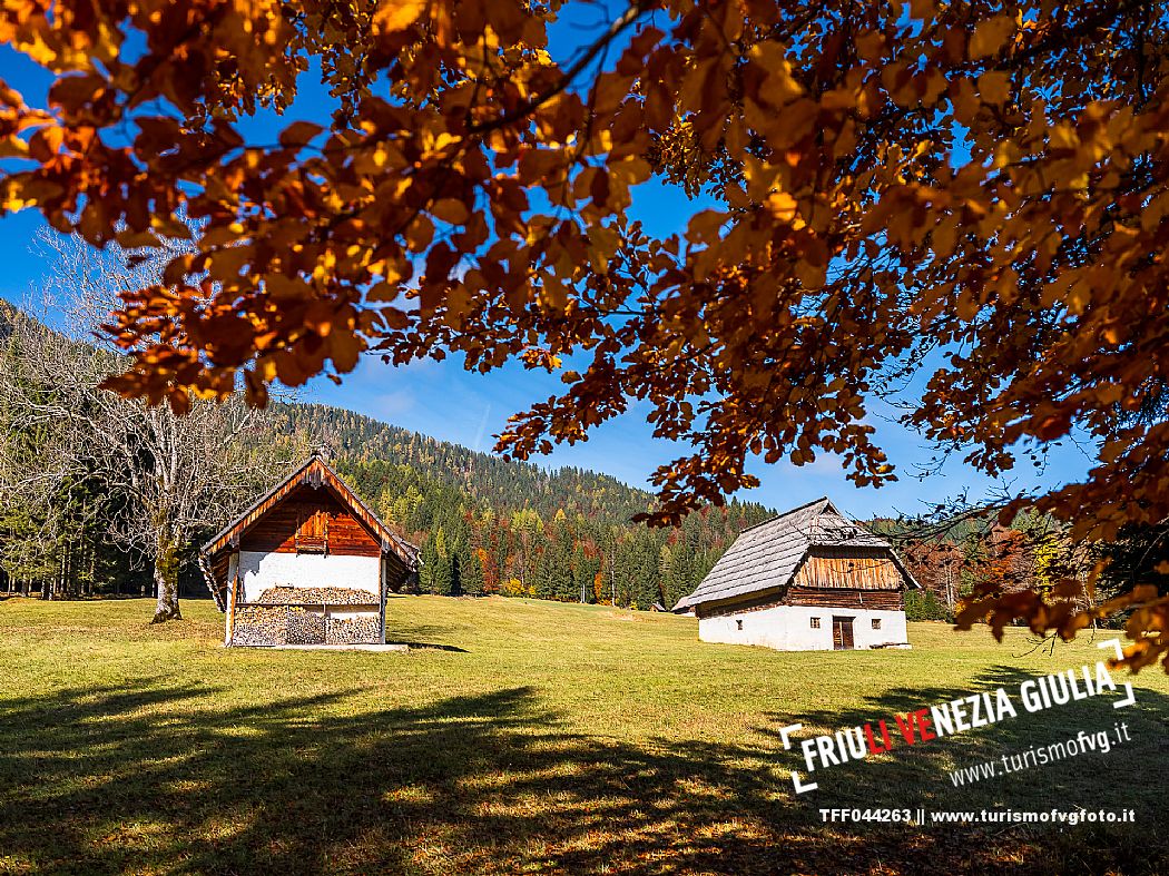 I prati della Val Bartolo. Qui ci si immerge nel verde, una distesa di prati puntellata dalle tradizionali baite, caratterizzate dal legno e dai tetti spioventi con balconi adorni di fiori. Paesaggi e trekking in autunno. Tarvisio, Alpi Giulie.