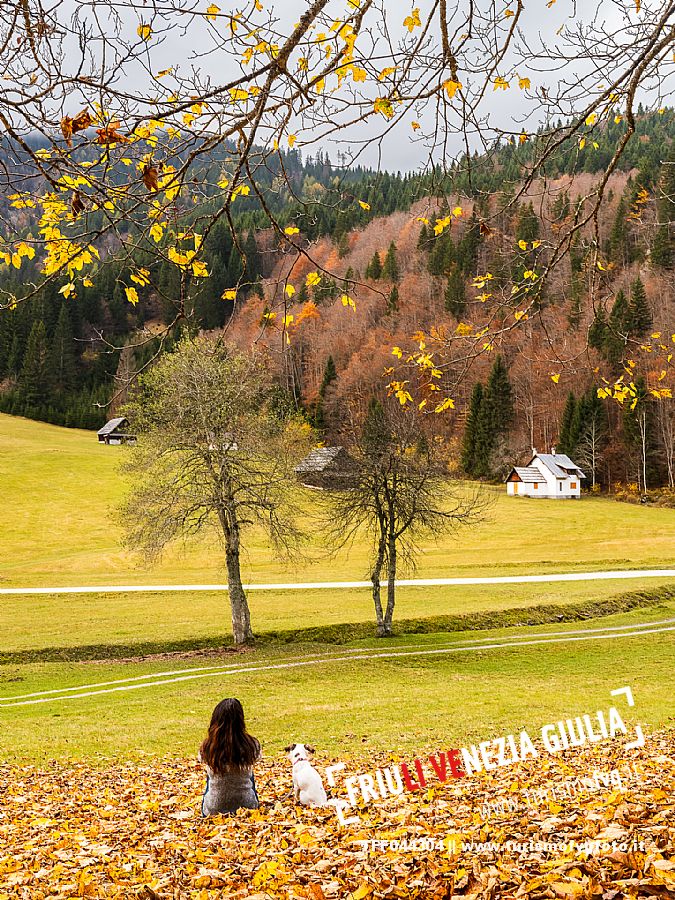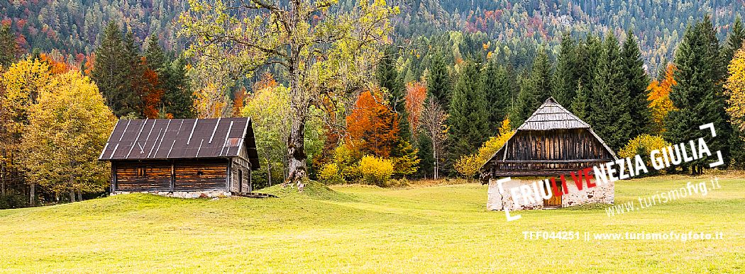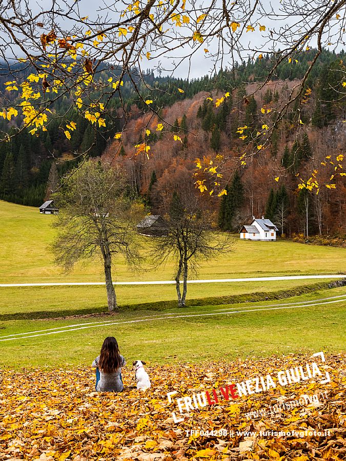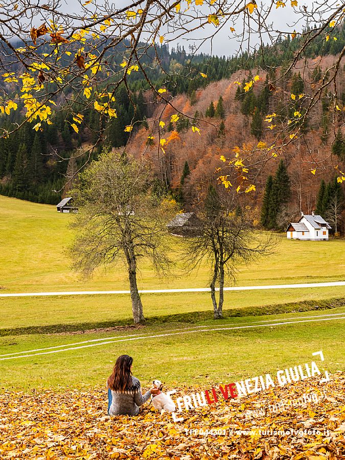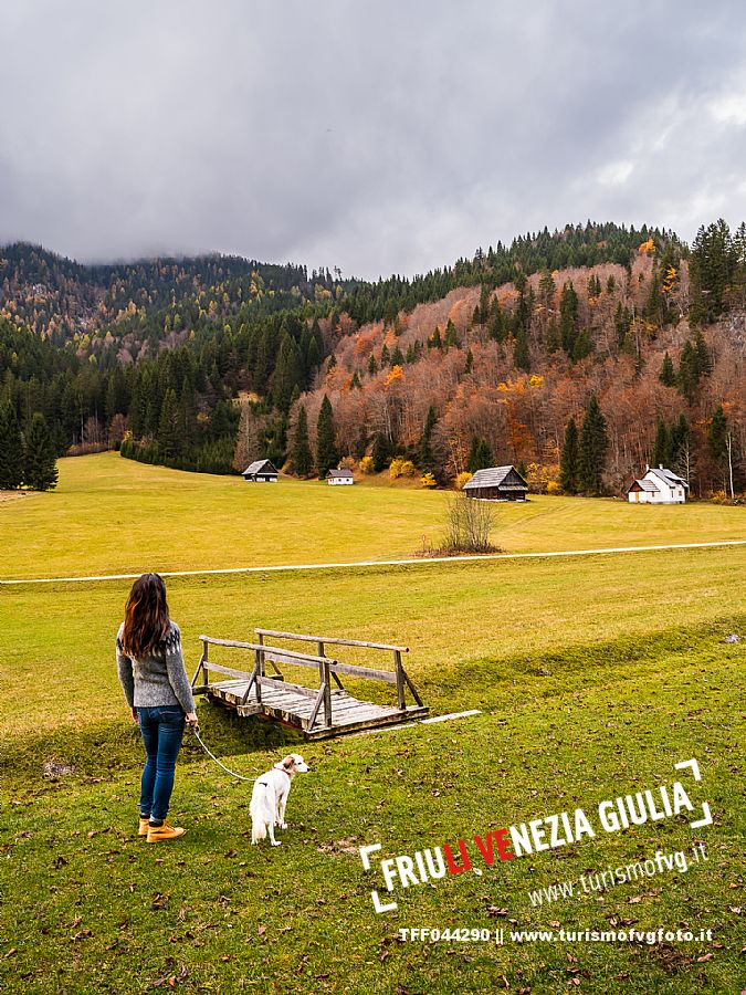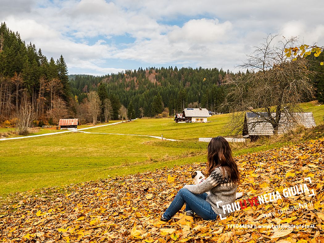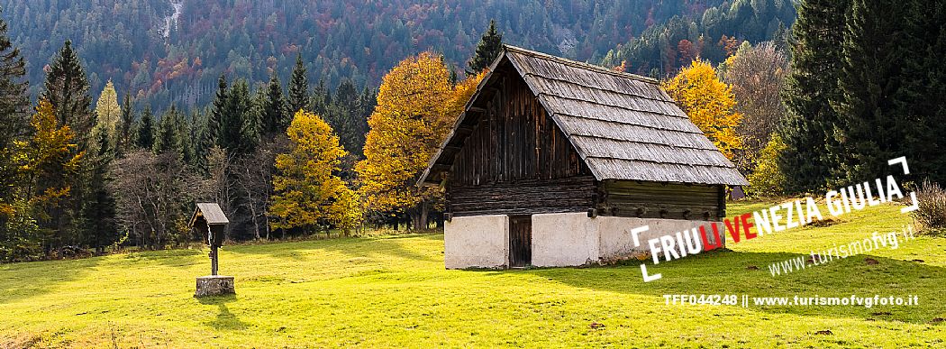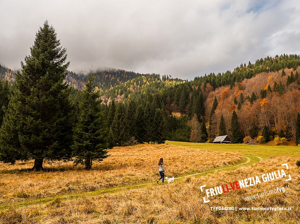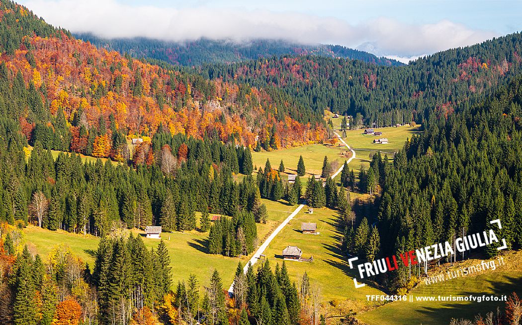 I prati della Val Bartolo. Qui ci si immerge nel verde, una distesa di prati puntellata dalle tradizionali baite, caratterizzate dal legno e dai tetti spioventi con balconi adorni di fiori. Paesaggi e trekking in autunno. Tarvisio, Alpi Giulie.