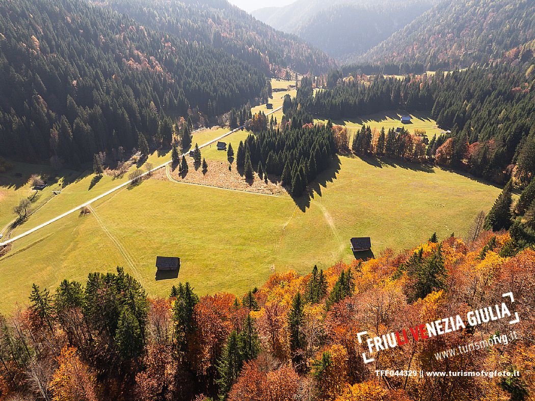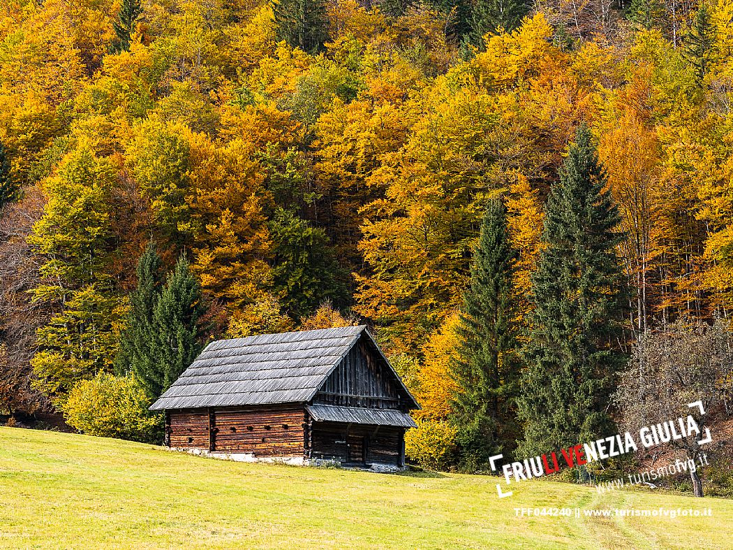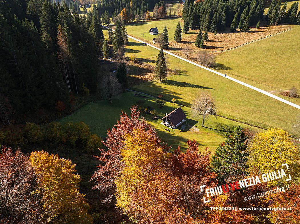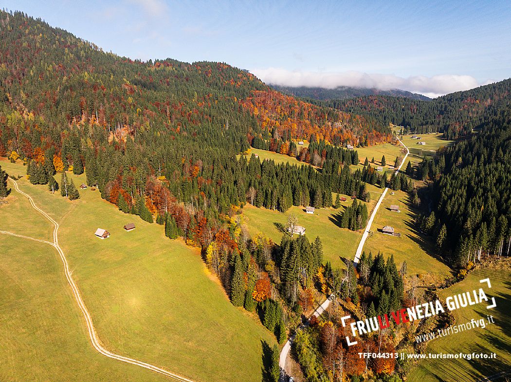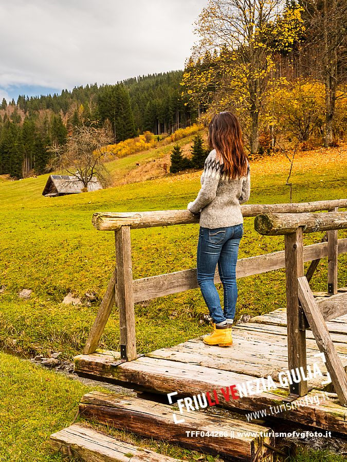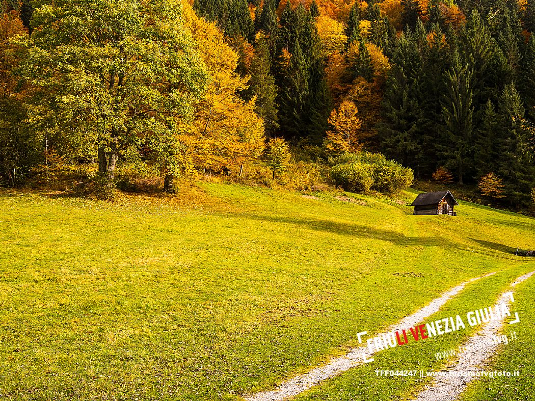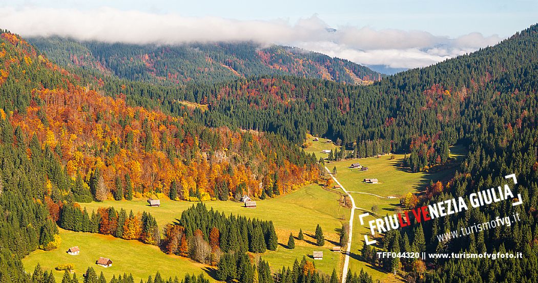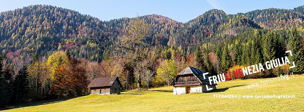 I prati della Val Bartolo. Qui ci si immerge nel verde, una distesa di prati puntellata dalle tradizionali baite, caratterizzate dal legno e dai tetti spioventi con balconi adorni di fiori. Paesaggi e trekking in autunno. Tarvisio, Alpi Giulie.