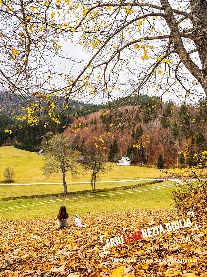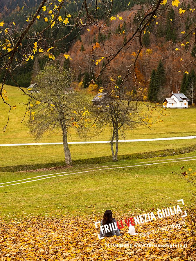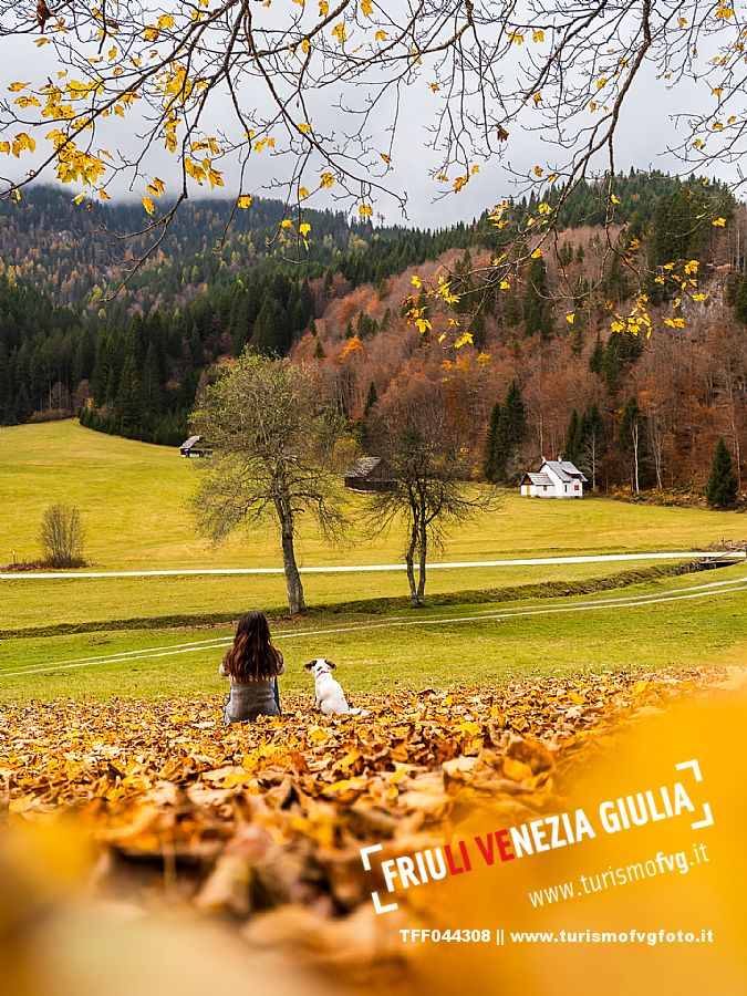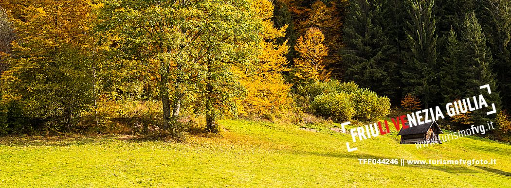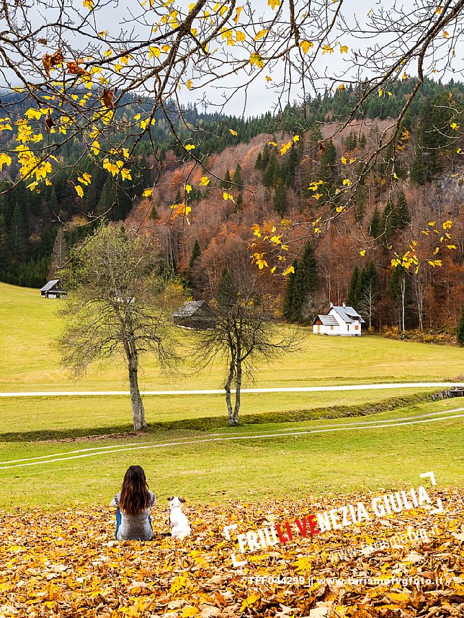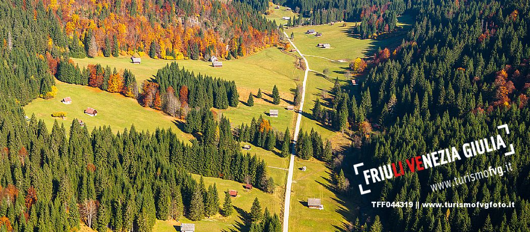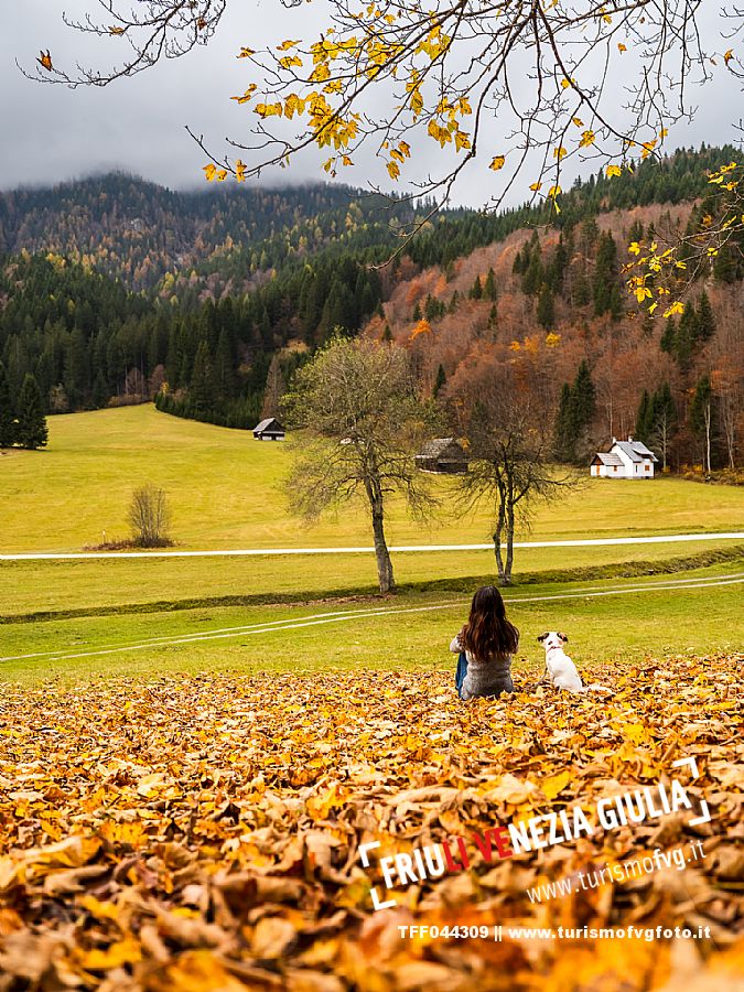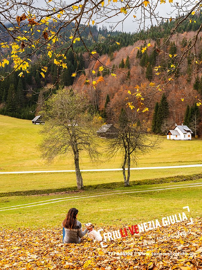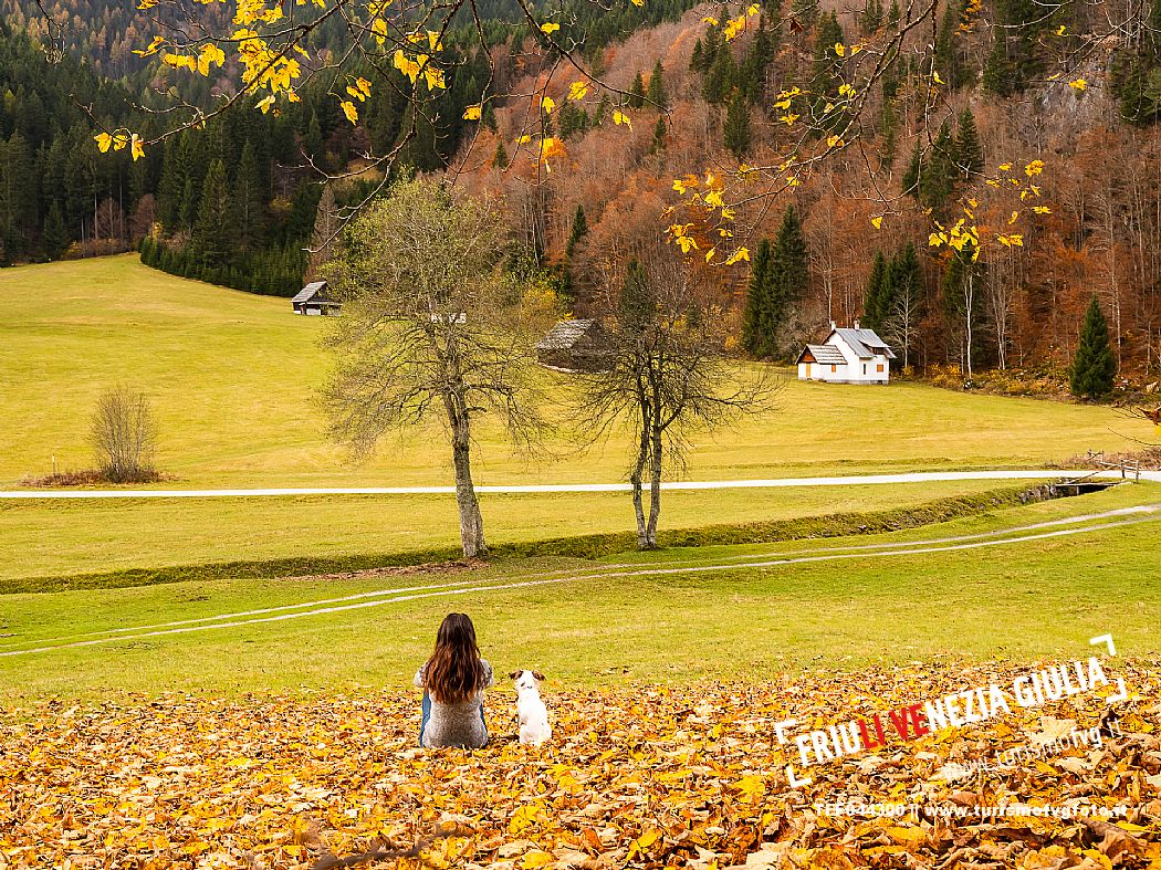 I prati della Val Bartolo. Qui ci si immerge nel verde, una distesa di prati puntellata dalle tradizionali baite, caratterizzate dal legno e dai tetti spioventi con balconi adorni di fiori. Paesaggi e trekking in autunno. Tarvisio, Alpi Giulie.