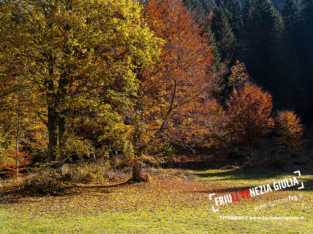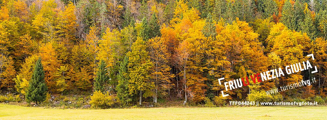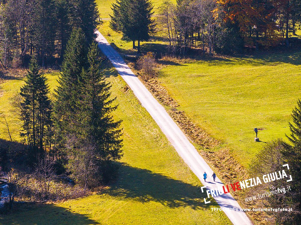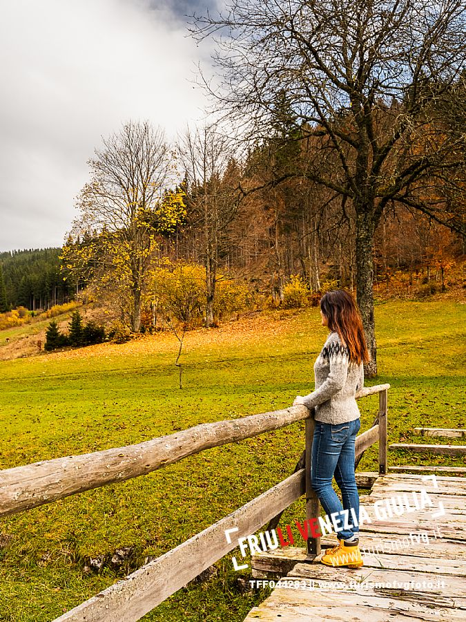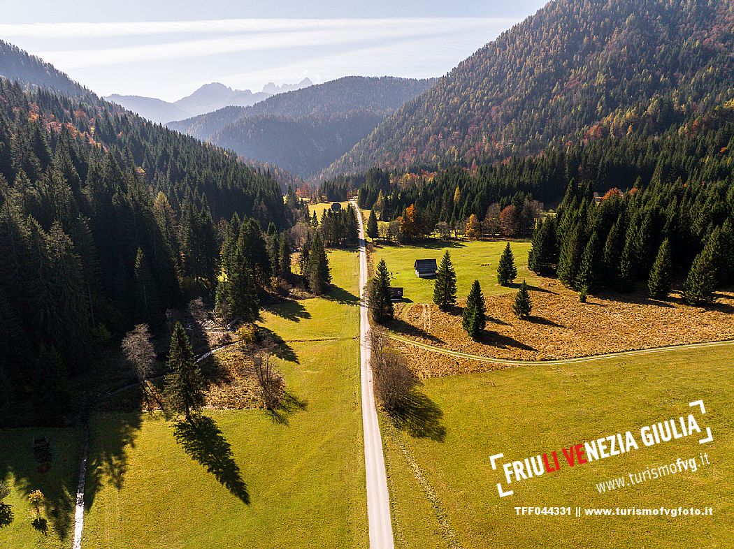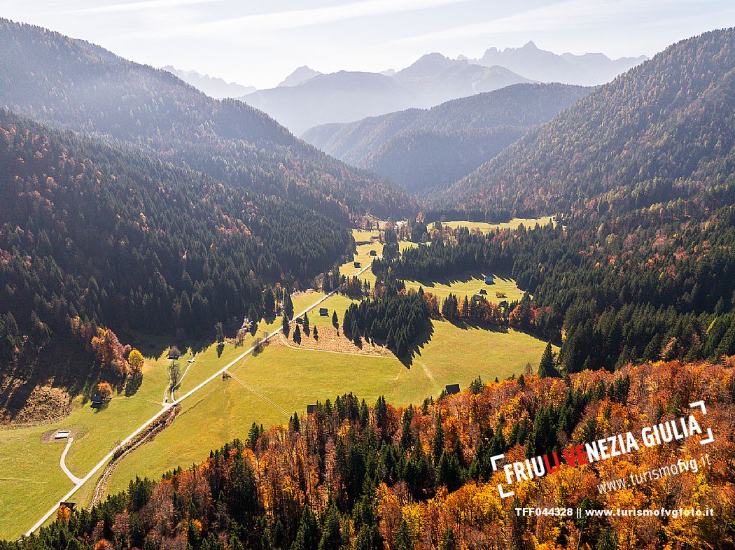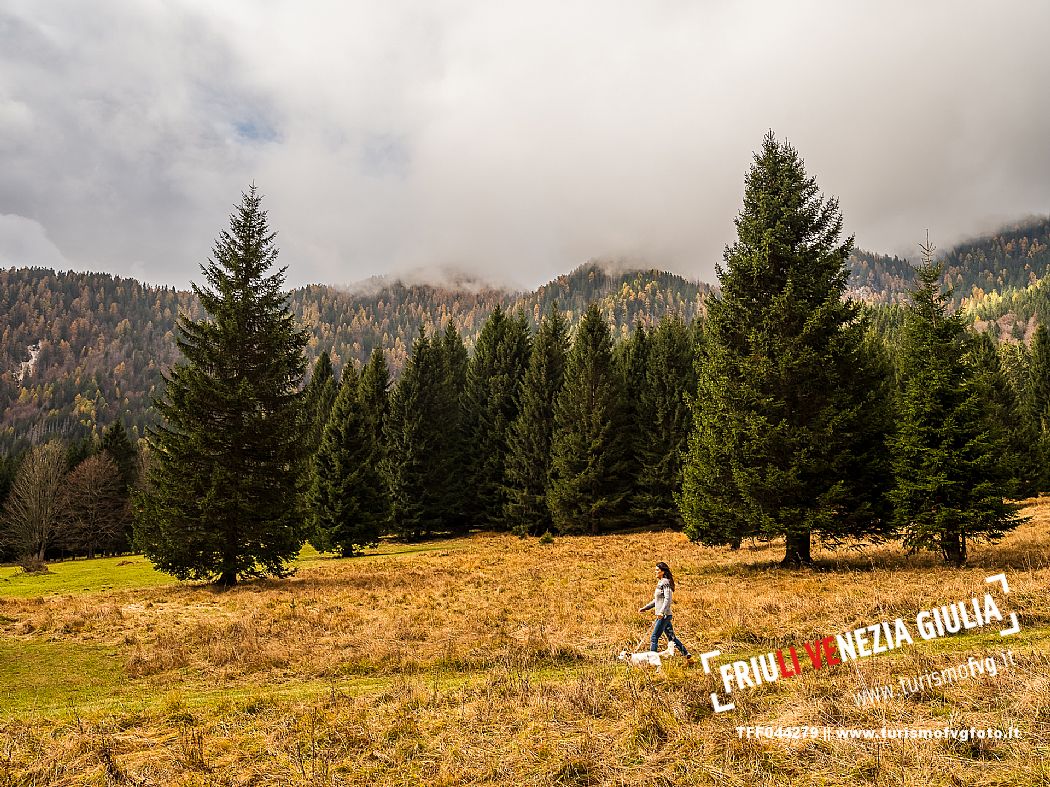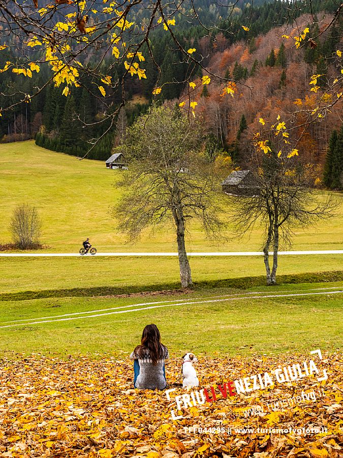 I prati della Val Bartolo. Qui ci si immerge nel verde, una distesa di prati puntellata dalle tradizionali baite, caratterizzate dal legno e dai tetti spioventi con balconi adorni di fiori. Paesaggi e trekking in autunno. Tarvisio, Alpi Giulie.