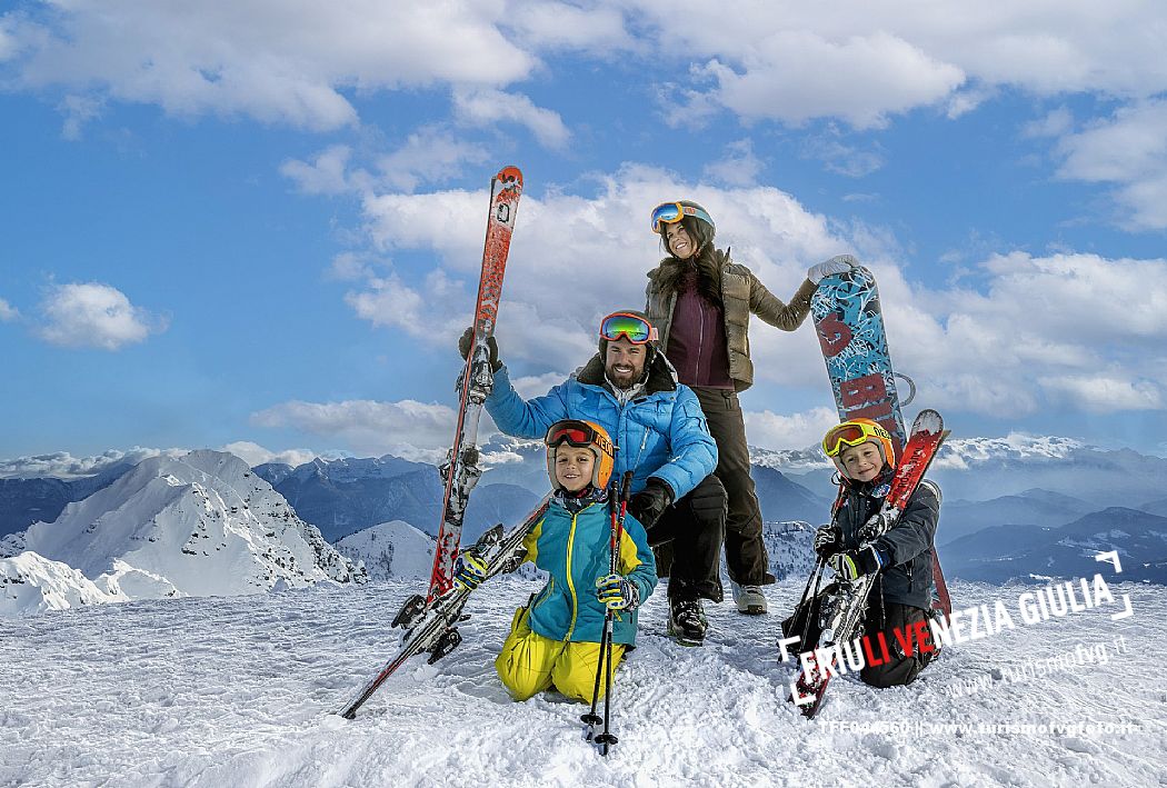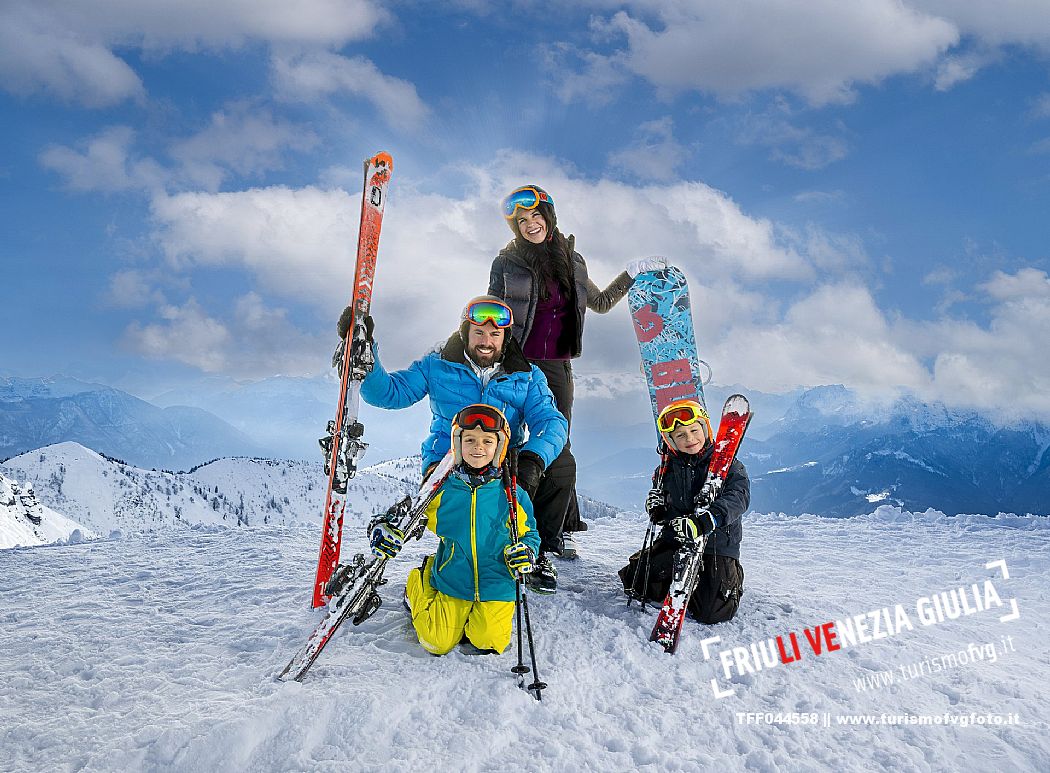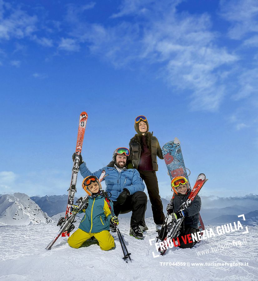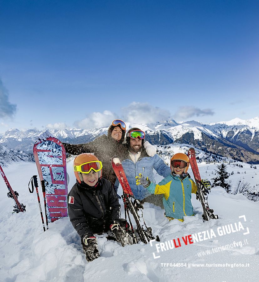 Una coppia con bambini sulle piste da sci del comprensorio dello Zoncolan in Carnia